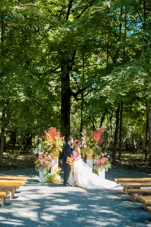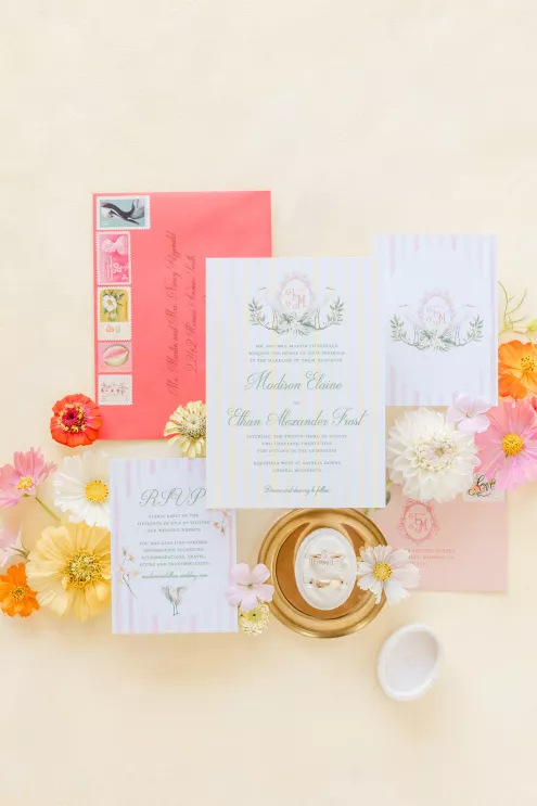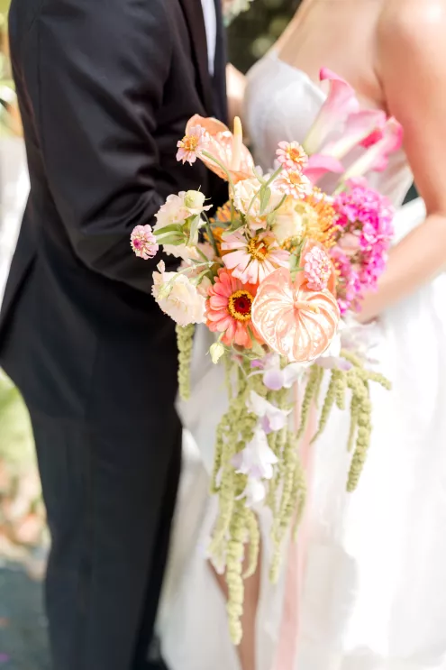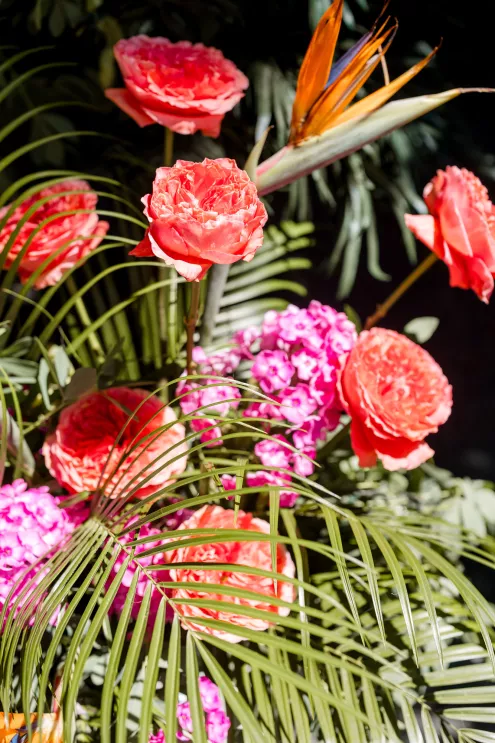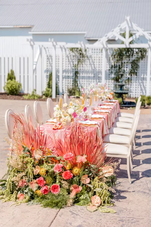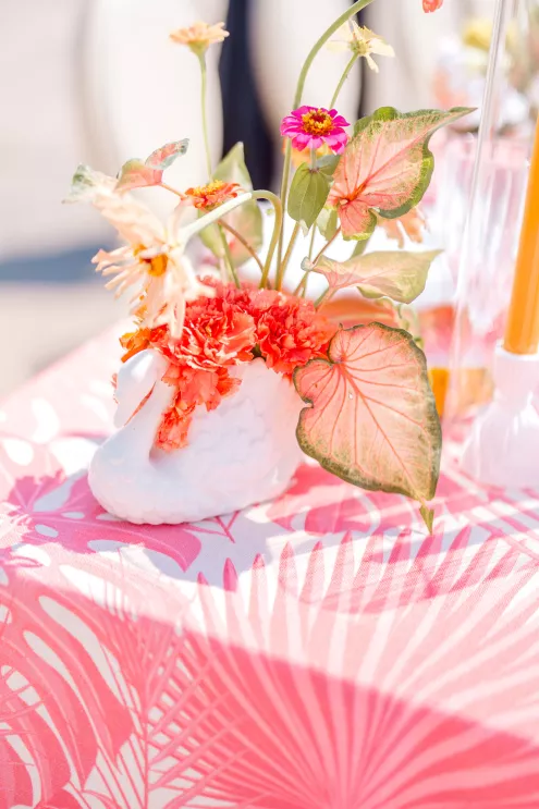 Robyn and Juniper Rose Floral created an exuberant scene awash in fresh, summery colors of soft pink and coral with splashes of key lime green and lemon yellow. Subtle bird motifs were woven throughout the design, from the swan-adorned invitations to the feathery touch in the bride’s hair. Stealing the show are vintage swan vases filled with sprightly arrangements of protea, lilies, dahlias, roses and cosmos alongside delicate wildflowers. “They brought the whimsy and elegance this concept needed while honoring the bird inspiration in such a beautiful, understated way,” she says.