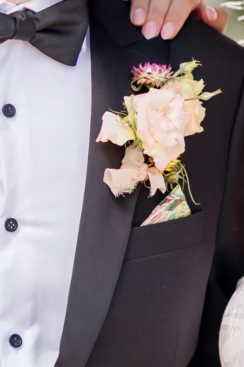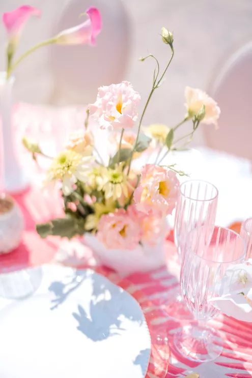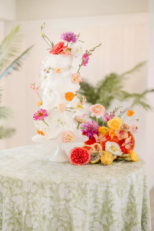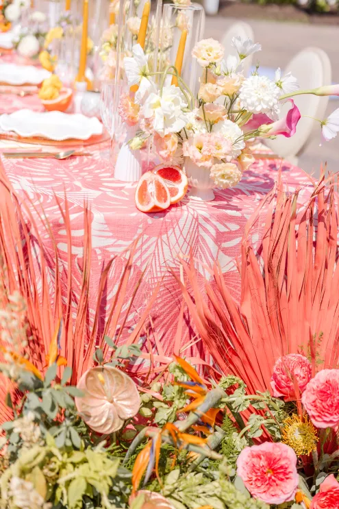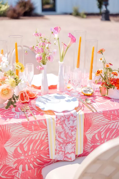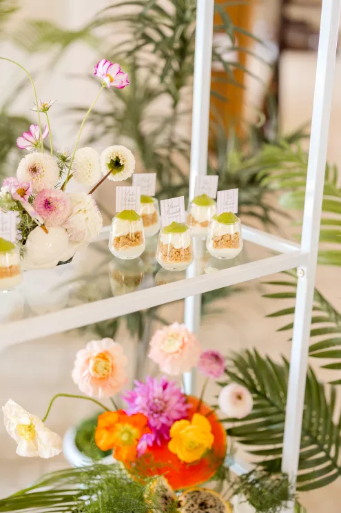 Throughout the design, sculptural anthurium leaves and tropical flora add Palm Springs vibes to the airy blooms. Adding a touch of playfulness are key lime pie shooters serving as escort cards. “With the fresh color palette and thoughtful layers of texture, the tablescape feels like a Palm Springs garden party translated into something timelessly elegant,” says Robyn.