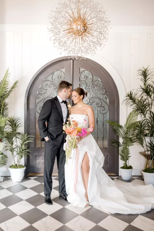 “Equestria West has a stunning sculpture of two birds intertwined, and it felt like the perfect starting point for a celebration about partnership and connection,” says photographer and designer Alexandra Robyn. “From there, we leaned into the playful, sun-soaked energy of Palm Springs with its iconic birds of paradise and vibrant palm landscapes.”