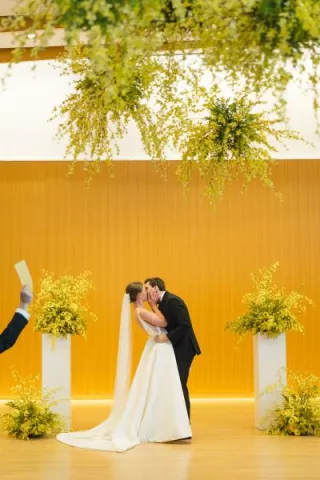 Tina Geha and Todd Steger knew they wanted to go big for their wedding. (Literally; 250 guests attended.) Finding a venue with style that could hold everyone wasn’t easy—until they walked into the Machine Shop. “We fell in love with the Machine Shop when we first saw it,” Tina says. “It gave us the cool, industrial-modern feel we were looking for, had capacity large enough to hold our ceremony, cocktail reception, and dinner and dancing, and provided the perfect blank slate that allowed us to infuse our own style and vibe into it so that our wedding details were showcased beautifully.” They kept the colors classic but added modern touches, like a chic graphic pattern on the cake and a chef-prepared sushi station during the cocktail reception. “Most importantly, we wanted to ensure that our guests had a memorable and enjoyable experience,” Tina says.