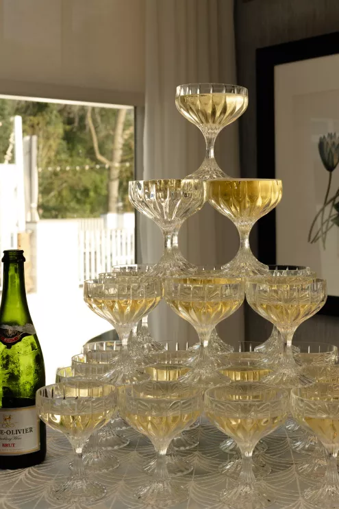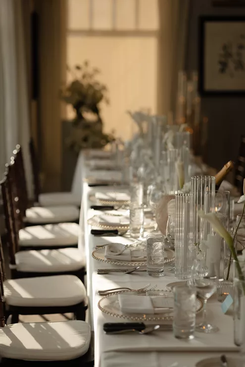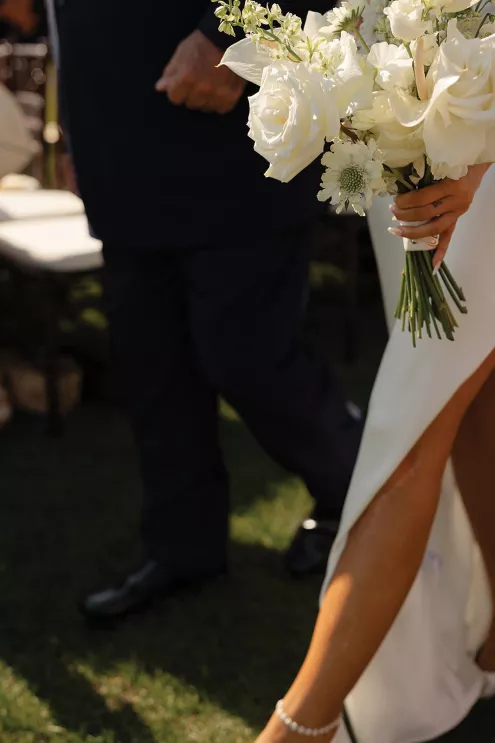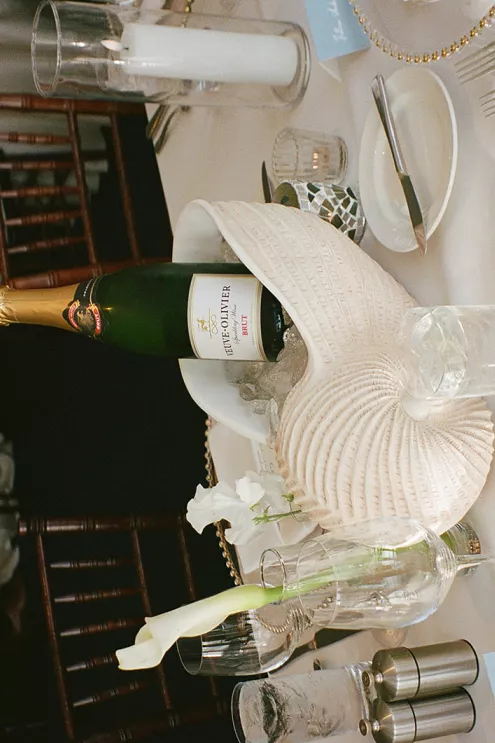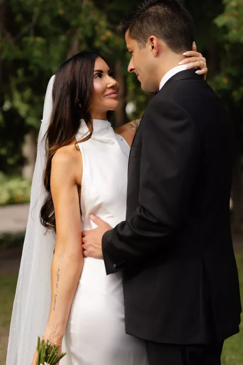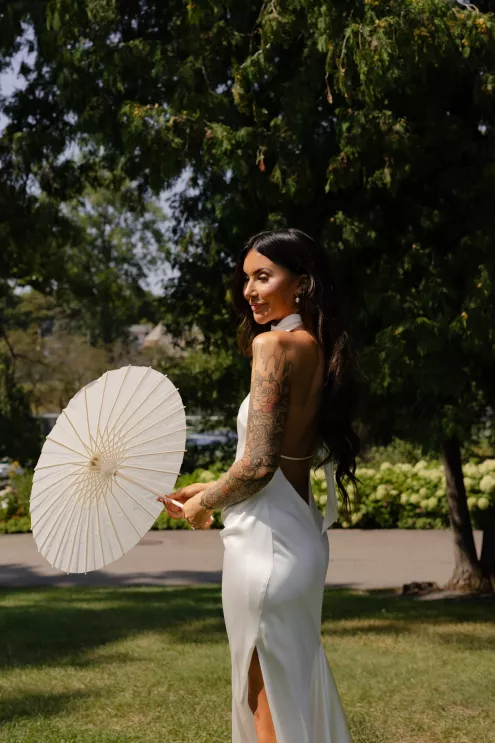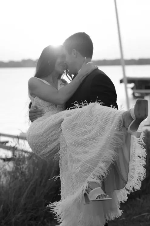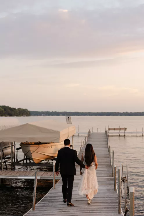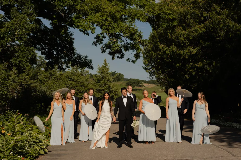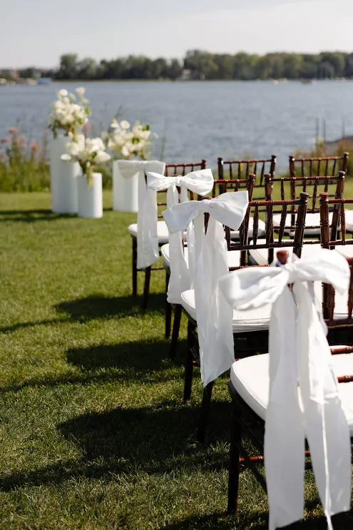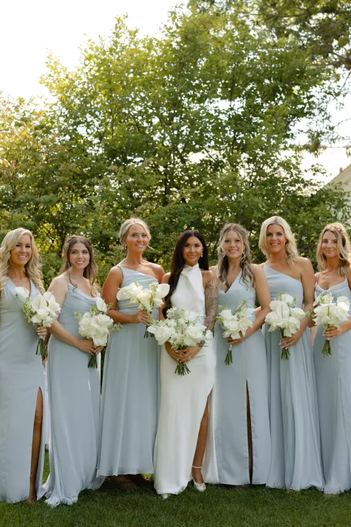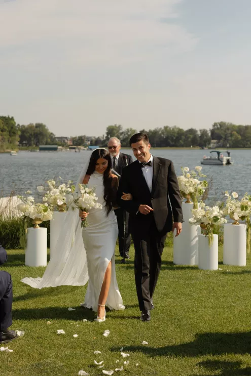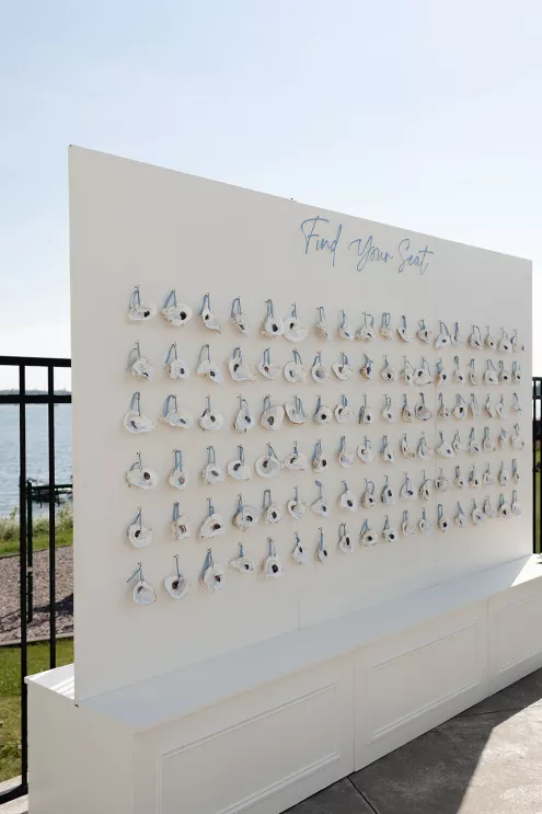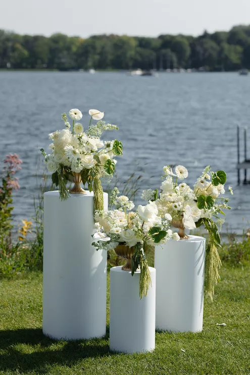 Jillian Davis and Austin Anderson forged a relationship to last a lifetime while living in Denver, Colorado. When he moved to Minneapolis for a job, the couple persevered through months of long distance, held together by romantic visits, until Jillian was able to relocate in 2021. Embracing their shared love of the ocean—particularly Coronado Island, California, where they planned to honeymoon—they planned a timeless celebration that combined coastal charm and modern elegance at the White Bear Yacht Club. At the end of a grassy aisle that overlooked the pristine lake was the groom, dashing in his classic black tux as he stood in front of gorgeous floral arrangements of calla lilies, white anthurium, white roses, lush dahlias and cascading green amaranthus, elevated on white pillars. With a delicate bundle of organically arranged blooms in one hand and her father’s arm in another, the bride made her way past ceremony seating decorated in chic white bows to her soon-to-be husband while looking effortlessly romantic in a satin sheath gown with a draped halter neckline and dramatic low back. The beachy theme was carried into the reception, where an escort card display of oyster shells invited guests to take their places at tables that absolutely stunned with their neutral colors and glassy details, which beautifully reflected the sunlight across the event space. A stylish design that featured large seashell centerpieces, nautical blue fonts across the signage and metallic balloons above the venue’s pool brought together Jillian’s vision. As she re-entered the celebration in her sparkling gown, a Champagne tower and espresso martini shooters started the party beneath a dazzling disco ball where the newlyweds and guests alike were free to dance to their heart’s content.