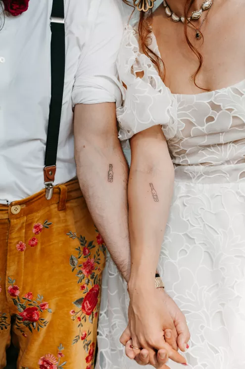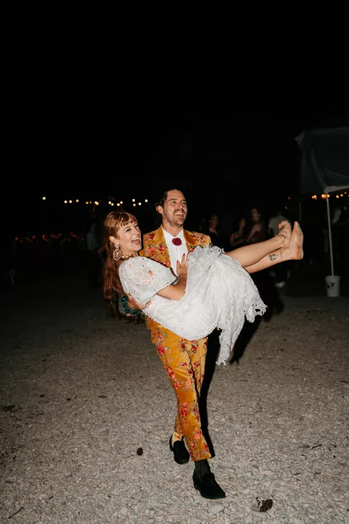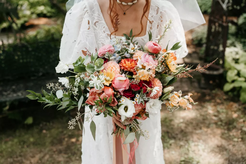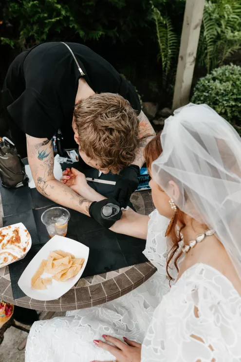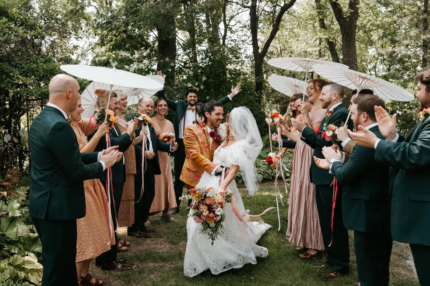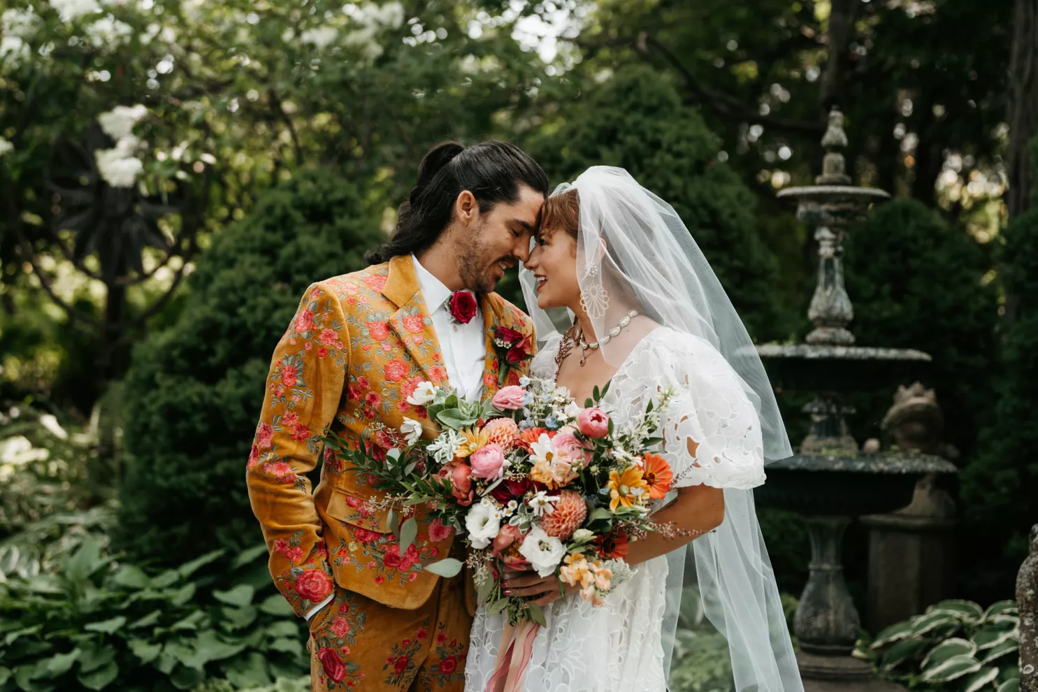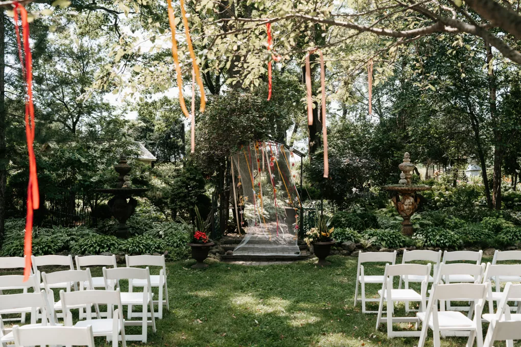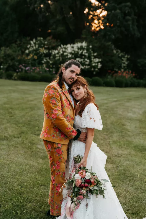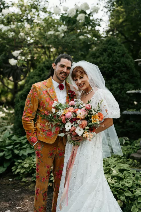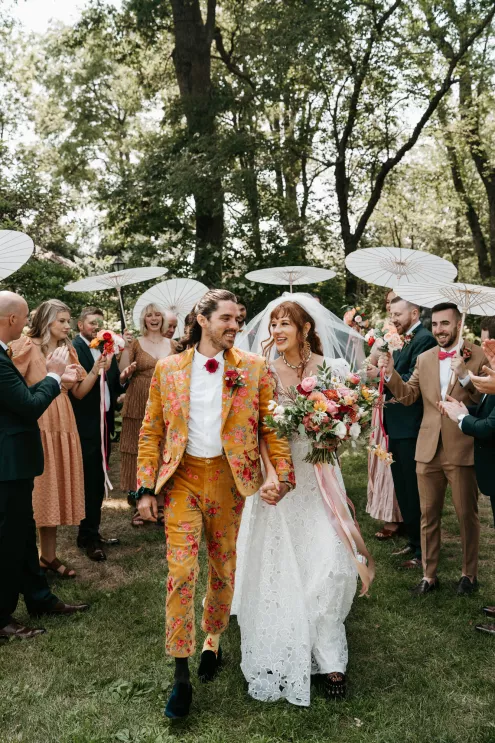 From the moment Will Tucker laid eyes on server Megan Muckenhirn at Lyons Bar in Minneapolis, he was completely enamored. The pair dated long-distance, and, in a grand gesture while Megan was flying to Seattle to move in with Will, he proposed to her in front of the entire plane on the intercom stating, “Baby girl, whether it’s Minneapolis, whether it’s Seattle, or 34,000 feet in the air, you are my home. I love you to death and I will love you forever.” Given their whirlwind romance, the eclectic couple’s wedding day at Berwood Hill Inn utilized ultra-intentional details to reflect their passionate personalities. The outdoor ceremony was bursting with color, vibrant shades of pink and orange ribbons swaying from trees, while florals in the same hues swathed across the rich greenery of the property. Megan accented her unique puff-sleeved floral gown with chunky statement jewelry while Will crafted a deeply personal ensemble. In lieu of a tie, he wore a red flower, donned mismatching socks—one being an Old Bay sock to represent his youth in Maryland—and commissioned a custom suit printed with flowers that were, completely coincidentally, his late mother’s favorite flowers. Following the ceremony, the newlyweds received matching tattoos of hot sauce bottles (which were also the party favors) and welcomed guests to roast them on an open mic. Loved ones were invited to ring bells from Megan’s late grandmother’s collection to encourage the pair to kiss and listen in on humorous poems written by Will’s Scottish grandfather, all while being offered complimentary tattoos and food truck tacos. Each and every detail of Megan and Will’s eccentric garden party was a direct reflection of the intentional joy they will continue to fuse into their lives, forever.