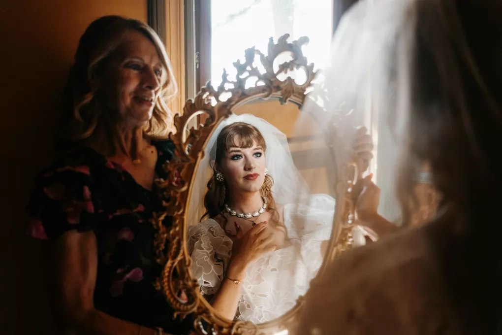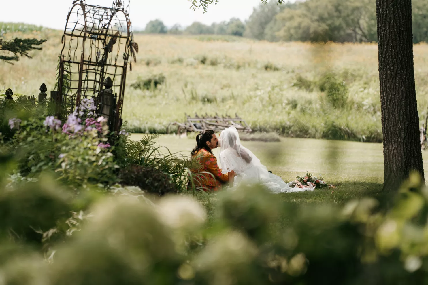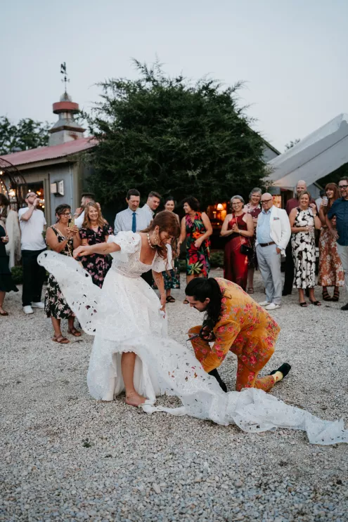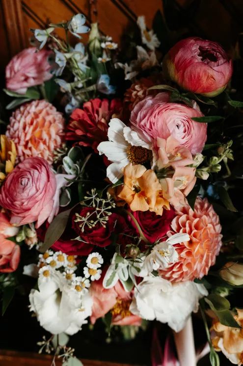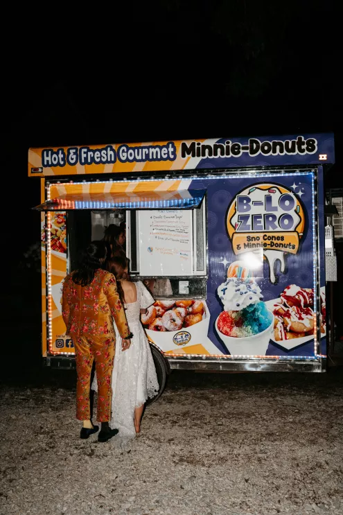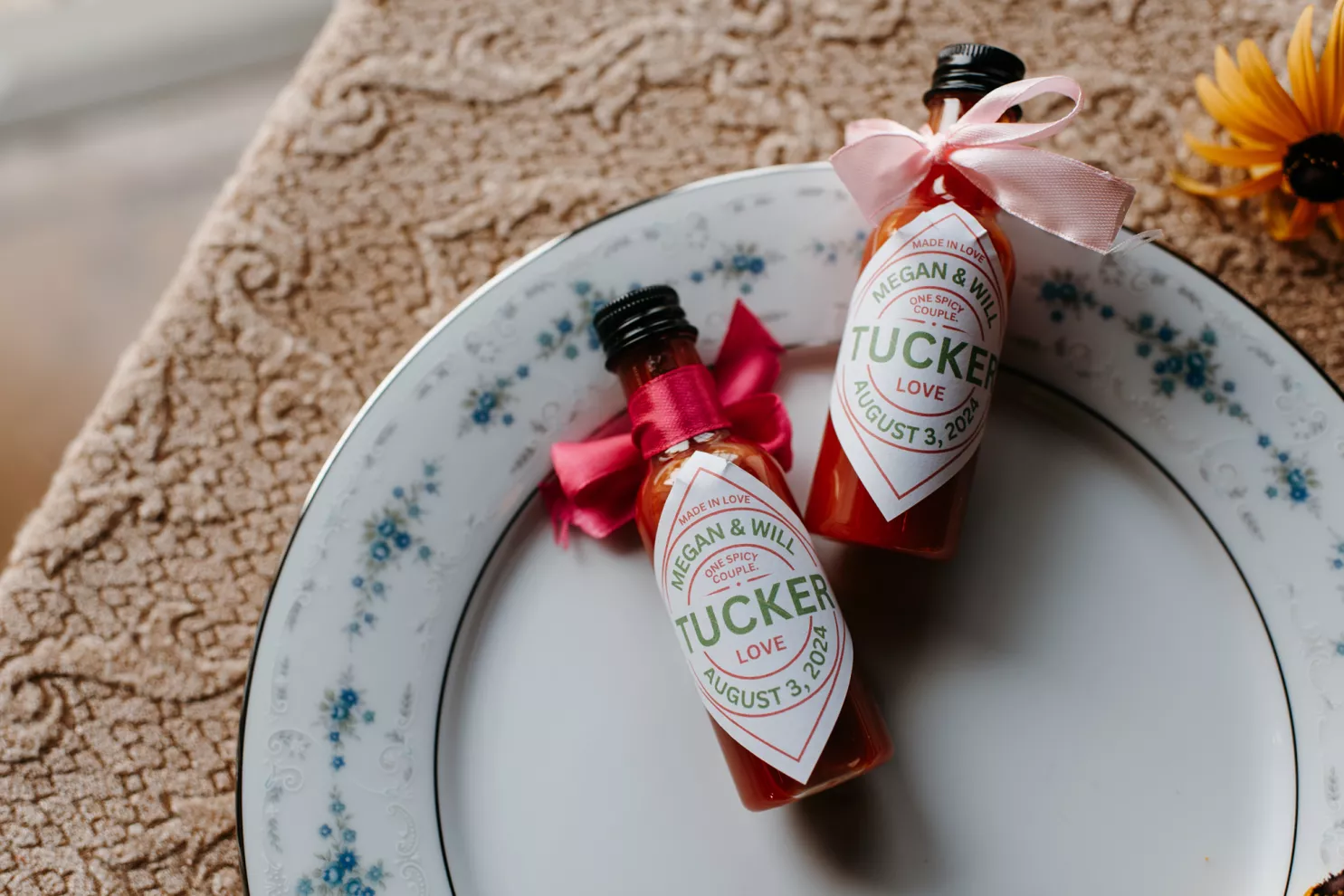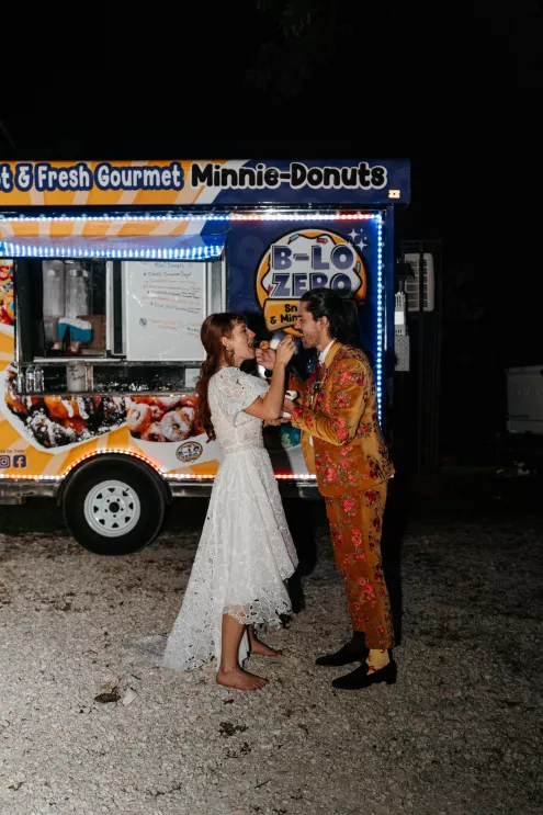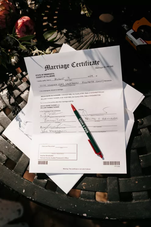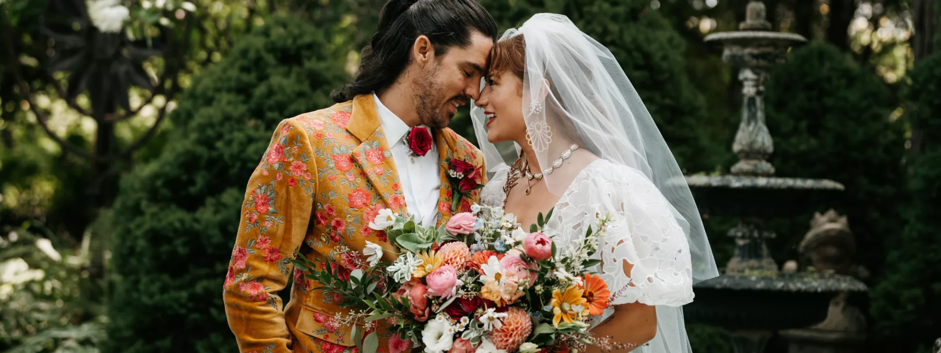 From the moment Will Tucker laid eyes on server Megan Muckenhirn at Lyons Bar in Minneapolis, he was completely enamored. The pair dated long-distance, and, in a grand gesture while Megan was flying to Seattle to move in with Will, he proposed to her in front of the entire plane on the intercom stating, “Baby girl, whether it’s Minneapolis, whether it’s Seattle, or 34,000 feet in the air, you are my home. I love you to death and I will love you forever.” Given their whirlwind romance, the eclectic couple’s wedding day at Berwood Hill Inn utilized ultra-intentional details to reflect their passionate personalities. The outdoor ceremony was bursting with color, vibrant shades of pink and orange ribbons swaying from trees, while florals in the same hues swathed across the rich greenery of the property. Megan accented her unique puff-sleeved floral gown with chunky statement jewelry while Will crafted a deeply personal ensemble. In lieu of a tie, he wore a red flower, donned mismatching socks—one being an Old Bay sock to represent his youth in Maryland—and commissioned a custom suit printed with flowers that were, completely coincidentally, his late mother’s favorite flowers. Following the ceremony, the newlyweds received matching tattoos of hot sauce bottles (which were also the party favors) and welcomed guests to roast them on an open mic. Loved ones were invited to ring bells from Megan’s late grandmother’s collection to encourage the pair to kiss and listen in on humorous poems written by Will’s Scottish grandfather, all while being offered complimentary tattoos and food truck tacos. Each and every detail of Megan and Will’s eccentric garden party was a direct reflection of the intentional joy they will continue to fuse into their lives, forever.