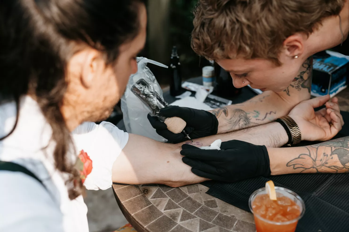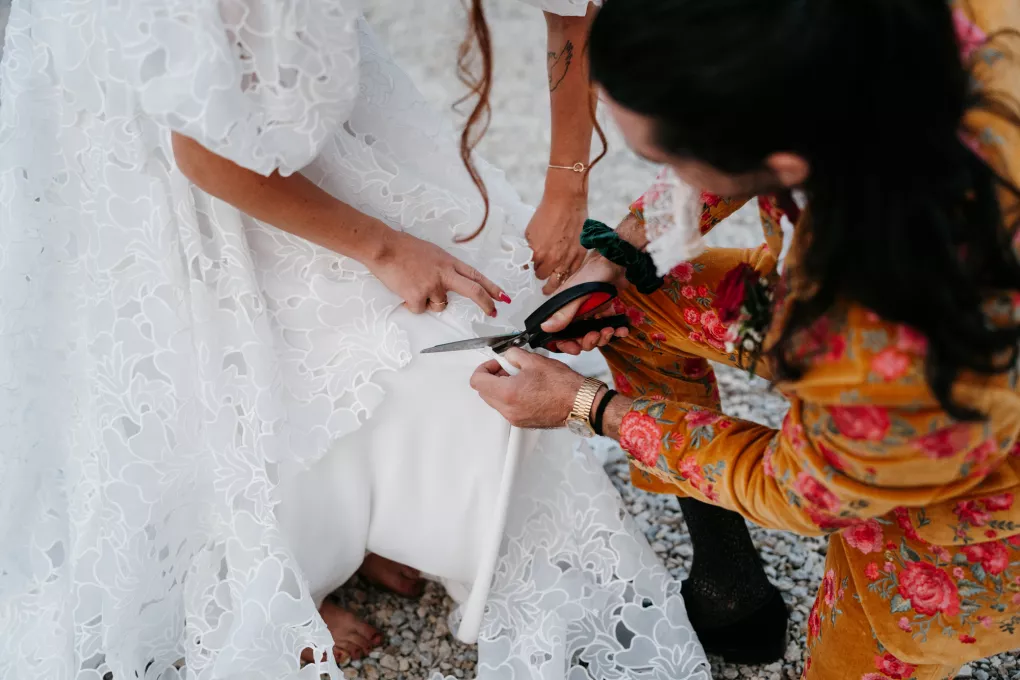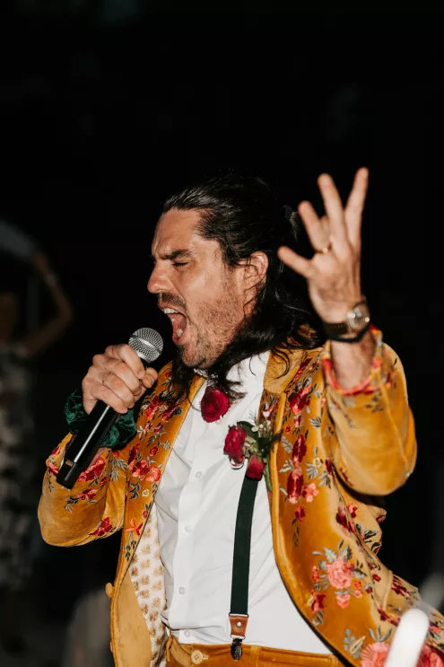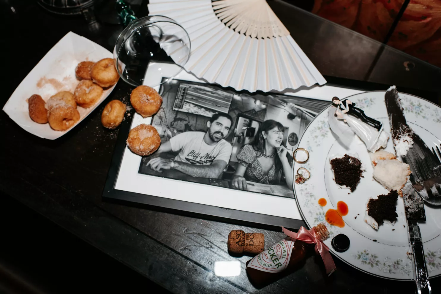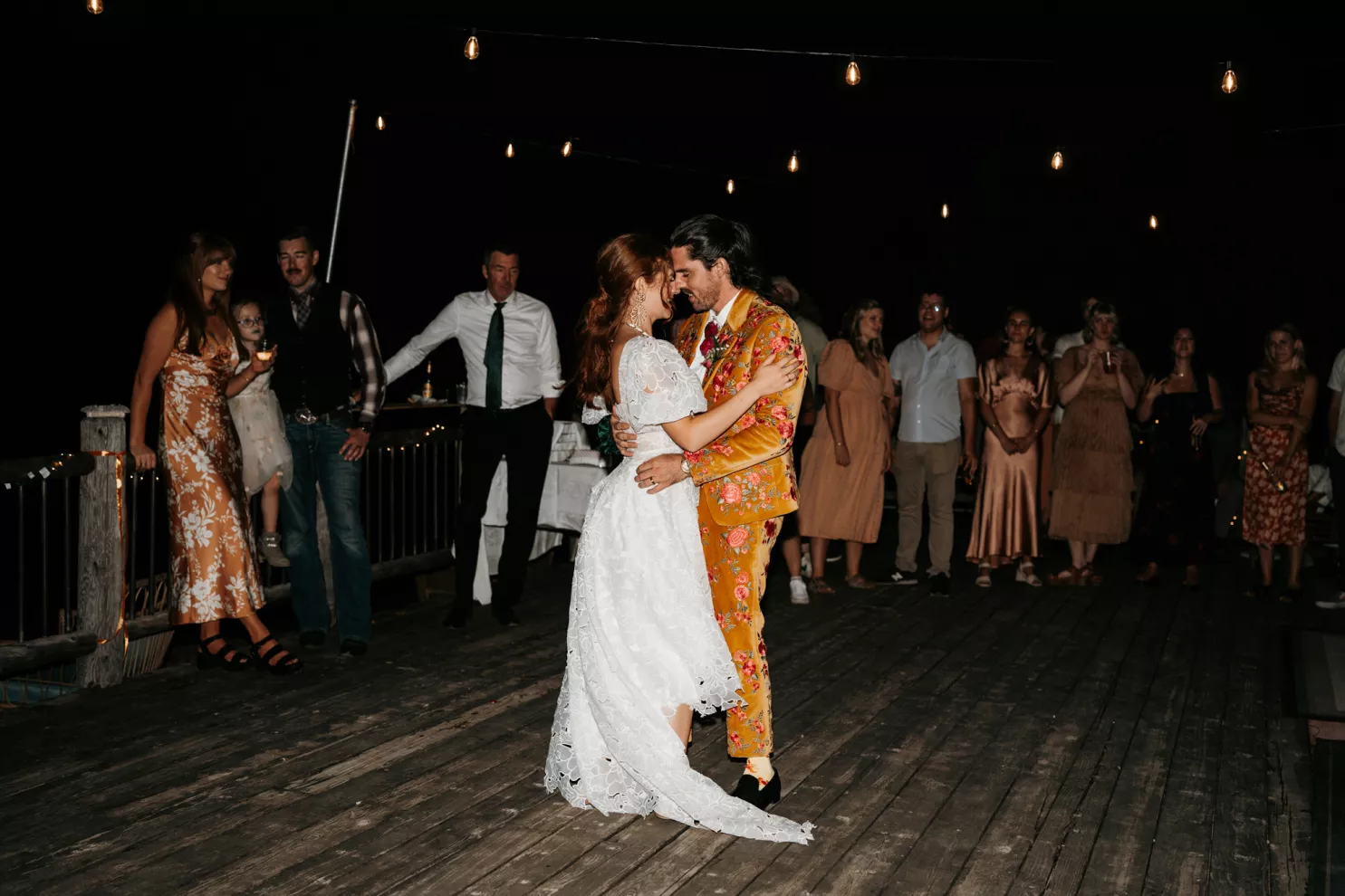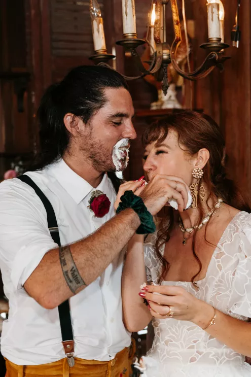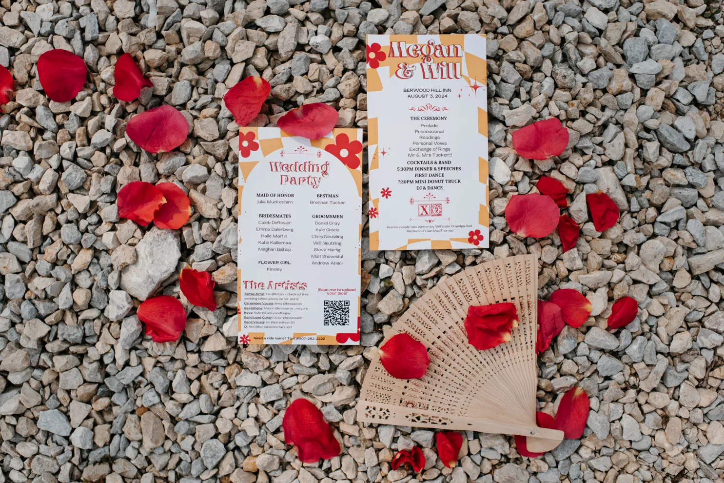 From the moment Will Tucker laid eyes on server Megan Muckenhirn at Lyons Bar in Minneapolis, he was completely enamored. The pair dated long-distance, and, in a grand gesture while Megan was flying to Seattle to move in with Will, he proposed to her in front of the entire plane on the intercom stating, “Baby girl, whether it’s Minneapolis, whether it’s Seattle, or 34,000 feet in the air, you are my home. I love you to death and I will love you forever.” Given their whirlwind romance, the eclectic couple’s wedding day at Berwood Hill Inn utilized ultra-intentional details to reflect their passionate personalities. The outdoor ceremony was bursting with color, vibrant shades of pink and orange ribbons swaying from trees, while florals in the same hues swathed across the rich greenery of the property. Megan accented her unique puff-sleeved floral gown with chunky statement jewelry while Will crafted a deeply personal ensemble. In lieu of a tie, he wore a red flower, donned mismatching socks—one being an Old Bay sock to represent his youth in Maryland—and commissioned a custom suit printed with flowers that were, completely coincidentally, his late mother’s favorite flowers. Following the ceremony, the newlyweds received matching tattoos of hot sauce bottles (which were also the party favors) and welcomed guests to roast them on an open mic. Loved ones were invited to ring bells from Megan’s late grandmother’s collection to encourage the pair to kiss and listen in on humorous poems written by Will’s Scottish grandfather, all while being offered complimentary tattoos and food truck tacos. Each and every detail of Megan and Will’s eccentric garden party was a direct reflection of the intentional joy they will continue to fuse into their lives, forever.