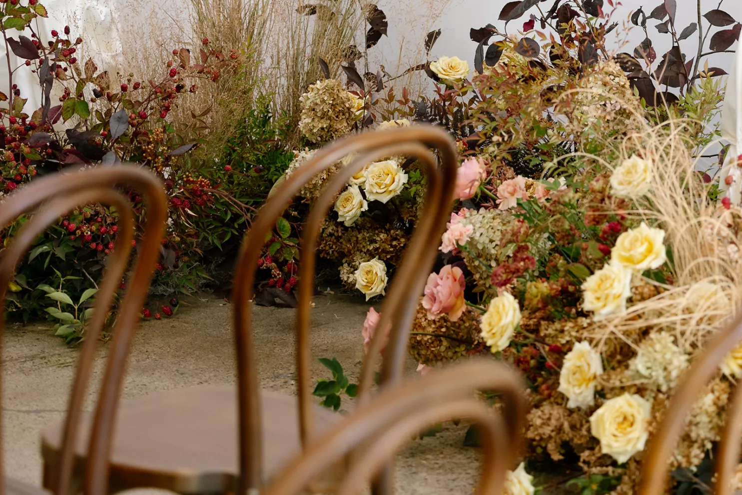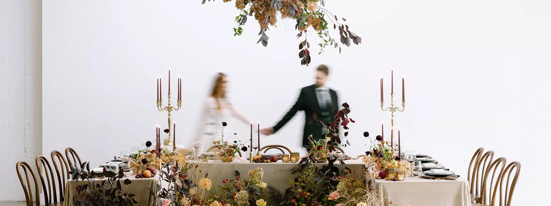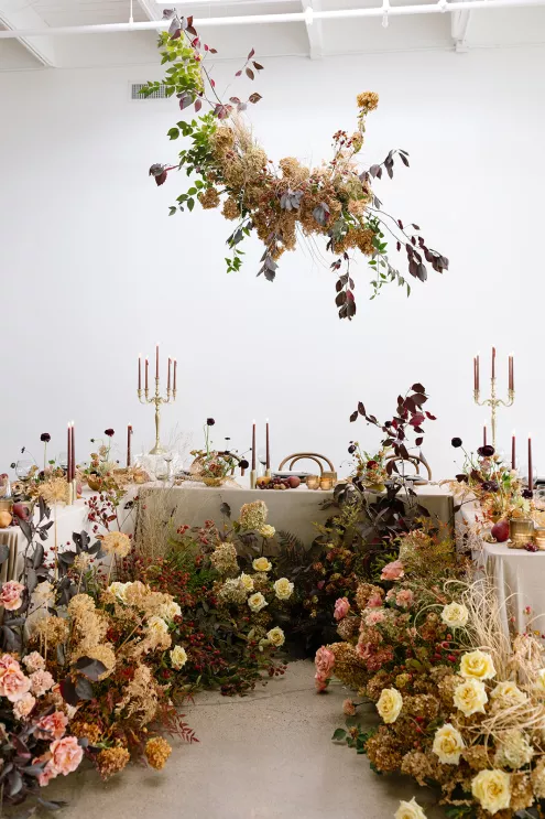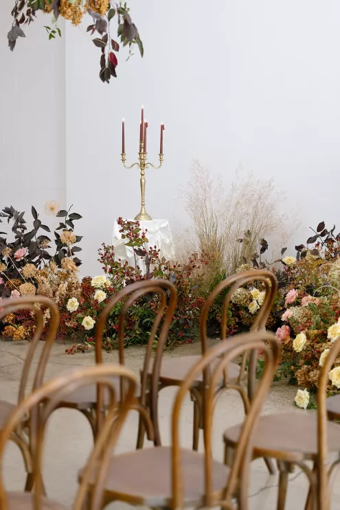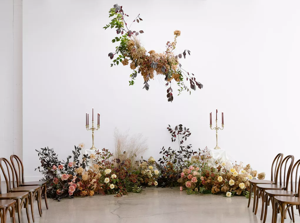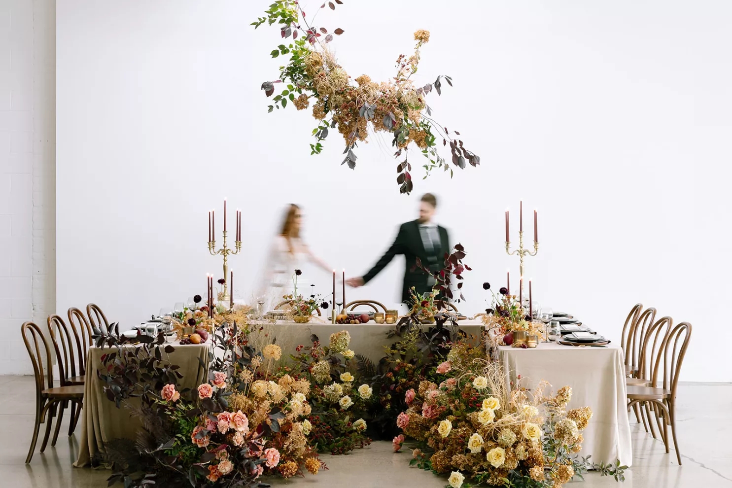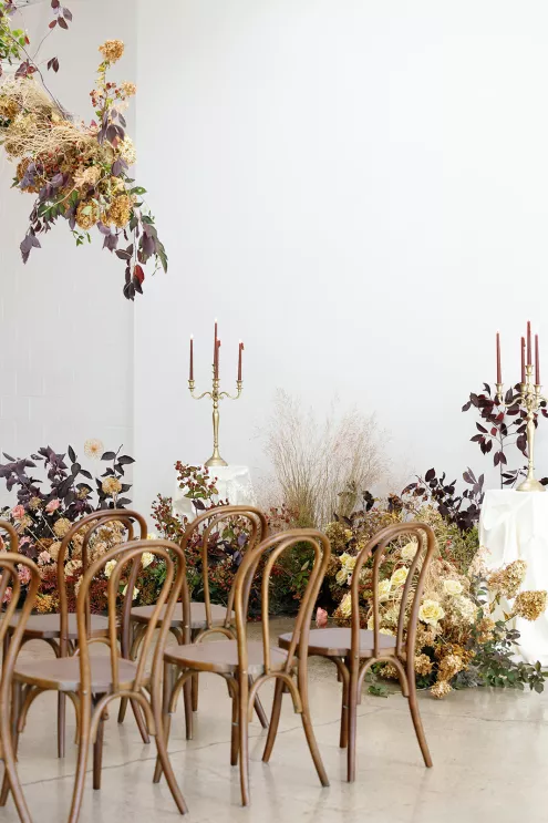 Embracing the essence of autumn, Archifête formulated an elevated and approachable design featuring spiced hues and luxe textures. Set against the modern simplicity of The Whim, the blank page allowed for a story of warm romance to be spun. Soft mauve candlesticks and an asymmetrical floating floral cloud framed the conceptualized ceremony. Grown ground installations appeared in a permanent golden hour glow by utilizing vibrant earth-toned vegetation and florals.