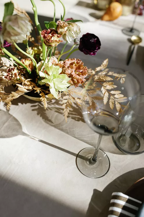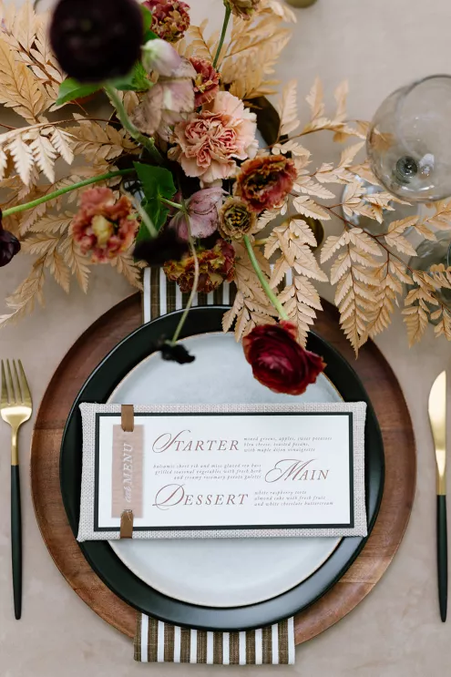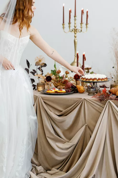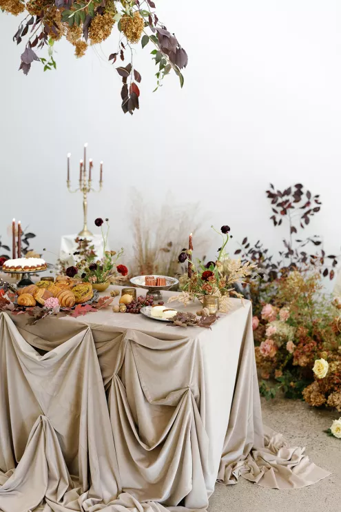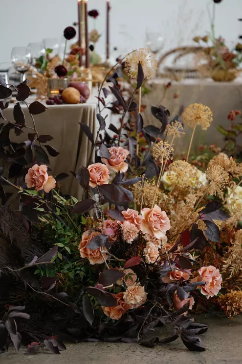 For the reception, the horseshoe-shaped tablescape bloomed with airy ranunculus, lisianthus and dried ferns to add a sense of depth to the table design. Walnuts and candlelight played against the metallic and cinnamon-toned tableware, enhancing the inviting ambiance. “To add depth to the tabletop design, we incorporated a variety of textures, including velvet, stoneware, wood, fruit, walnuts, candles, and linen,” says Breanne Burich, owner and lead designer of Archifête.