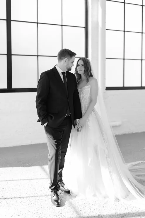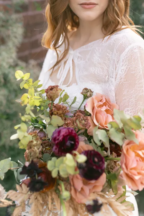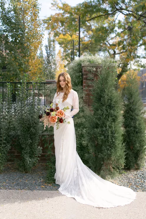The ethereal bridal attire enhanced the composition of the scene, with a bright harvest-toned blooms bouquet complementing the gauzy gown.