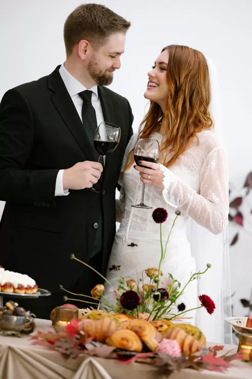 Pops of cabernet-colored ranunculus peppered a decadent dessert table featuring creations by Marc Heu Pâtisserie Paris. Notes Burich of the overall design, “It struck the perfect balance between elevated and approachable, offering inspiration that couples can incorporate into their own wedding.”