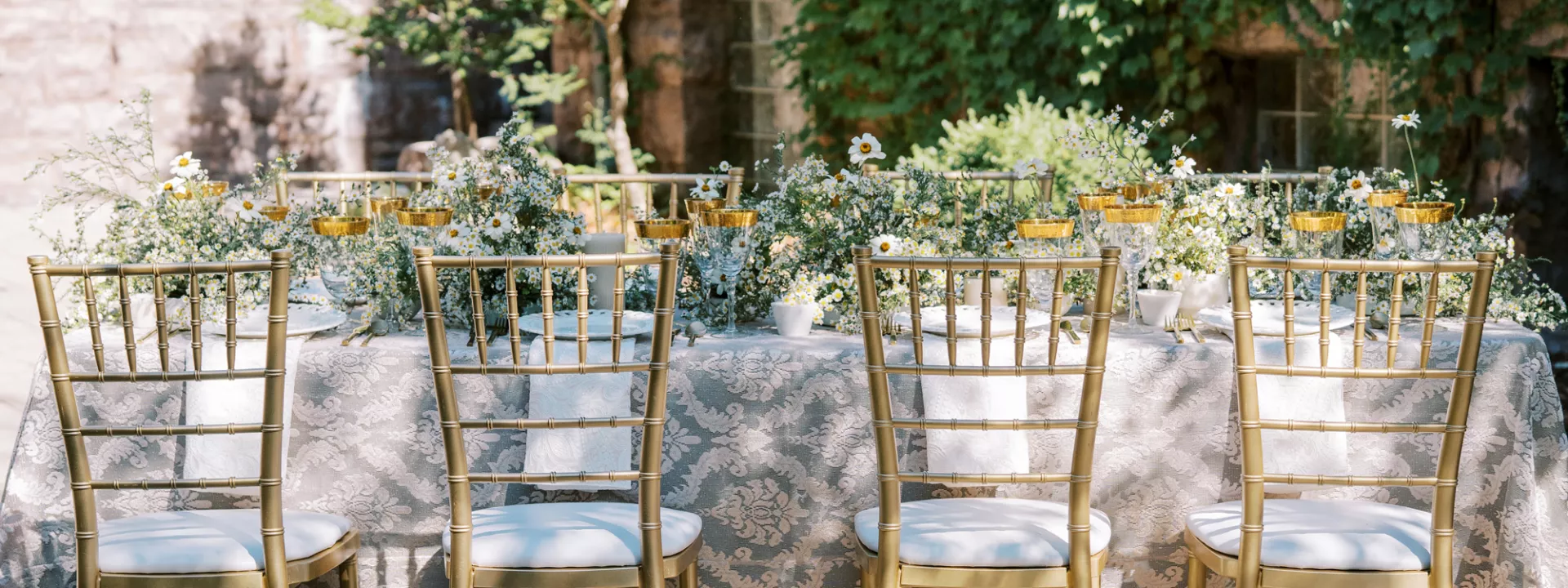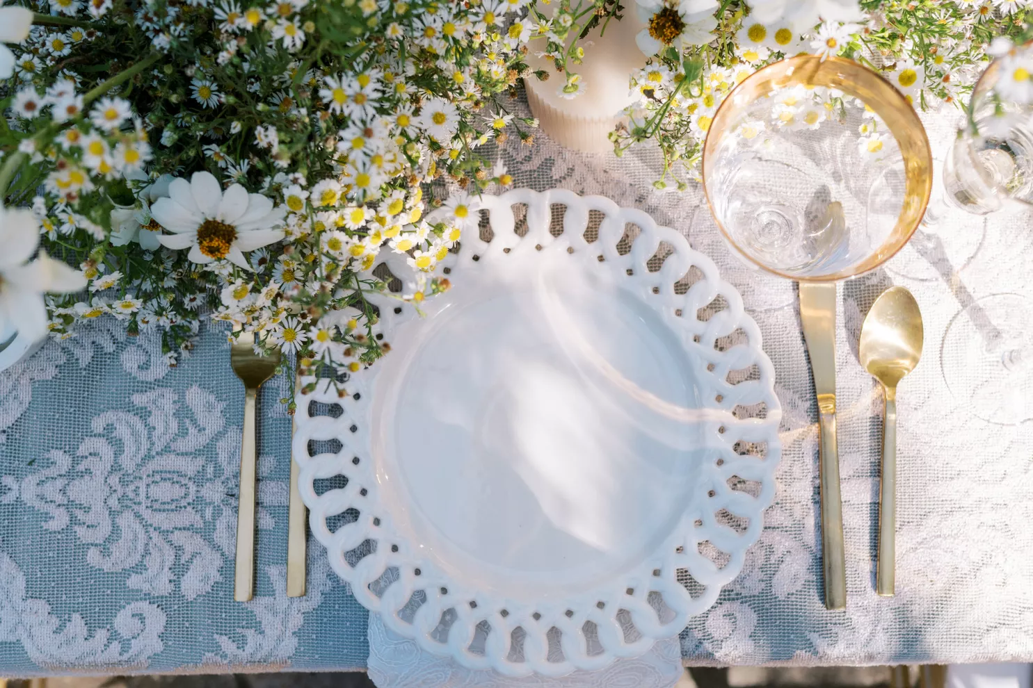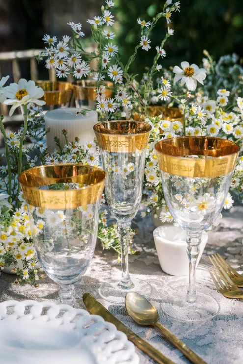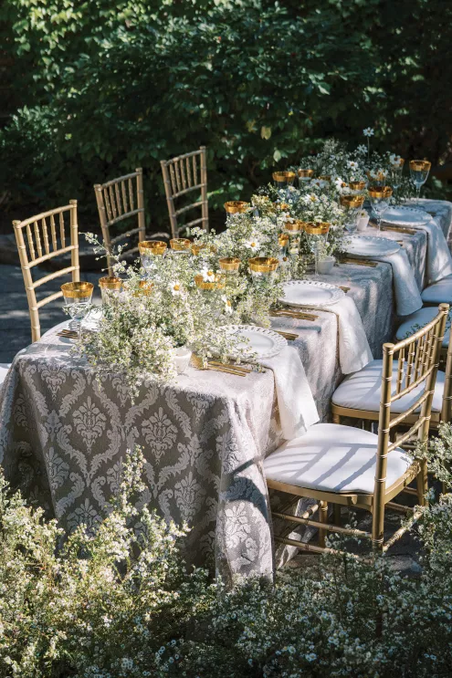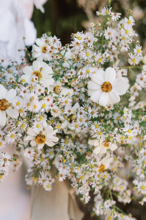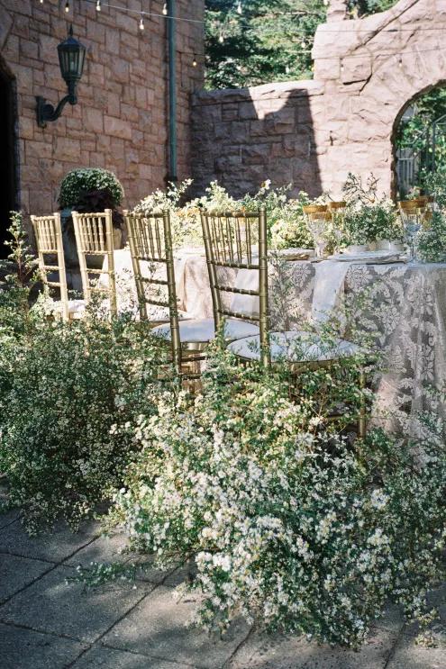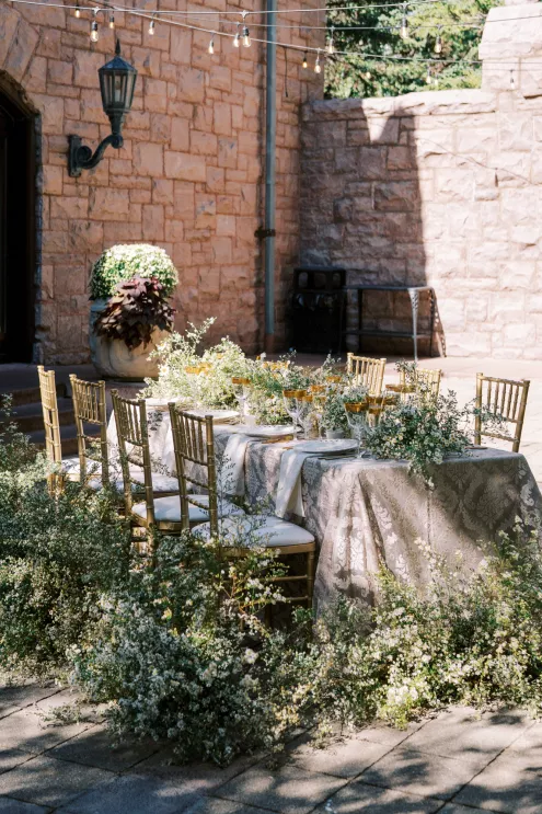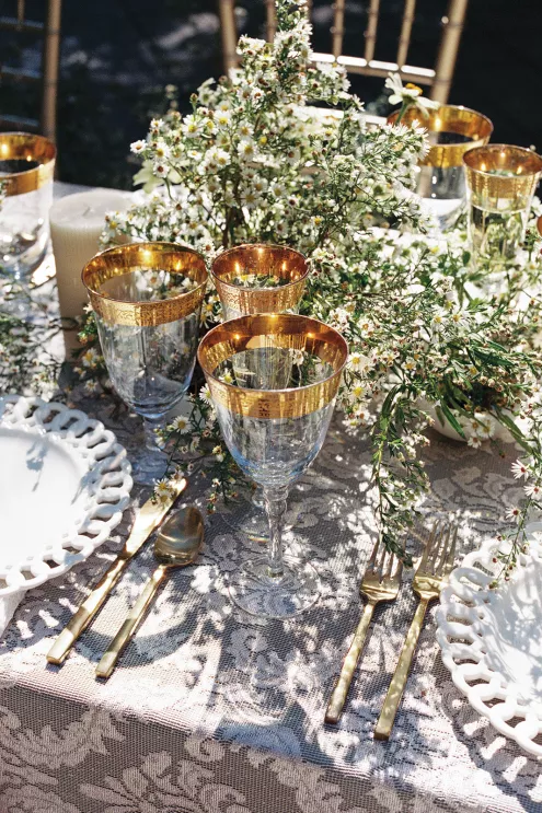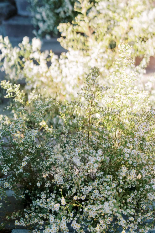 The reception table is lush, textured and overflowing with asters, white zinnia and feverfew flowers and adorned with a balance of modern and classic elements. “I wanted to create a floral runner that had organic edges— but not too tall for conversation,” Fox notes. “I love when practical design is considered in a new look—that becomes the sweet spot for successful tables in my book.” Anchored with a green linen layered with a warm-toned antique lace tablecloth, the tabletop features gold-rimmed glassware and lace-edge plates. The design relies on a few select floral varieties resulting in an abundantly lush look, from the bouquet to the tabletop runner. “When you can accomplish a look with fewer varieties the experience is elevated,” Fox says. “Select flowers en masse creates an environment to savor.”