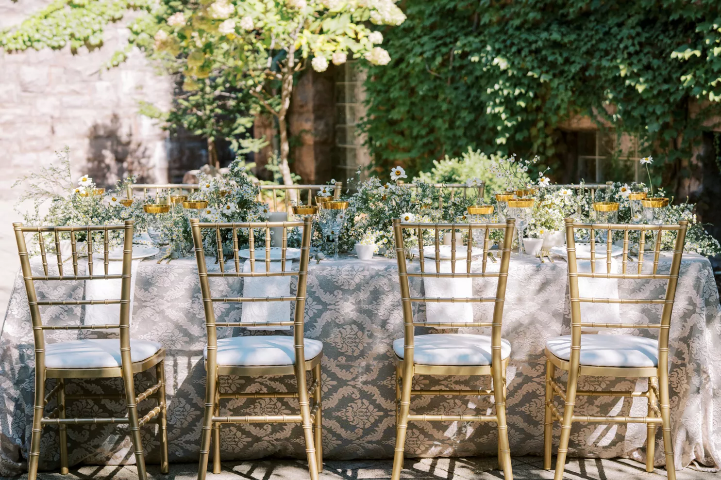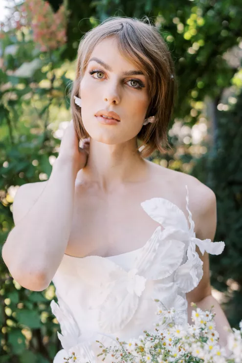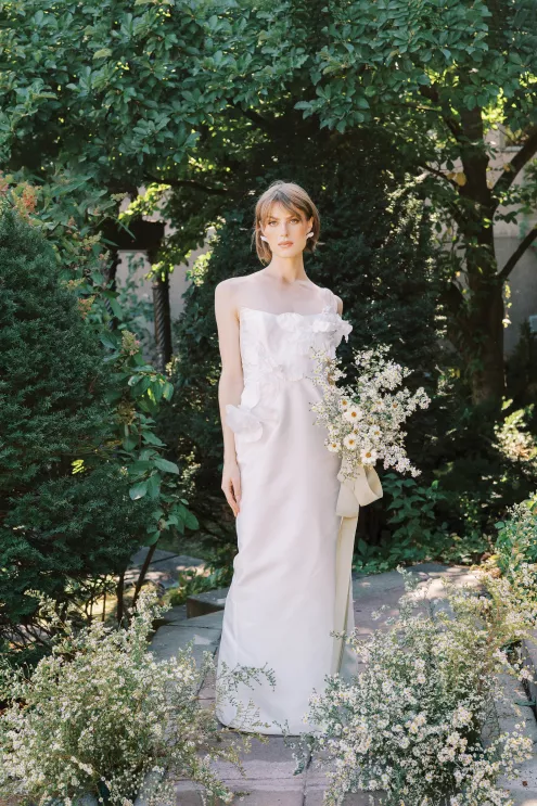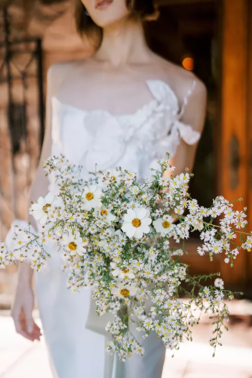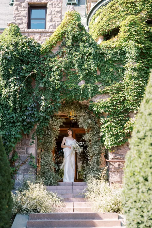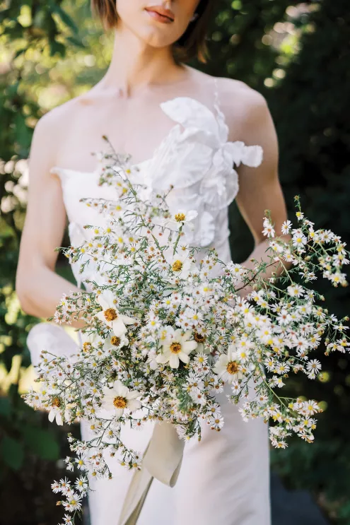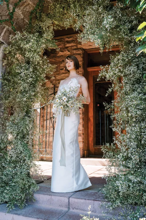 “I couldn’t stop thinking about the juxtaposition of small, seasonal textured aster alongside the traditional stone of the Van Dusen Mansion,” says Ashley Fox of Ashley Fox Designs. “My favorite thing is to design to the architecture of a space.” Utilizing locally grown florals, Fox created a delicate, bloom-filled setting at the historic estate that is rich in texture and movement. The mansion’s arched entryway is draped in blooming aster accented with white limonium, creating an elegant focal point. Pairing the perfect bridal gown is a must, thus a column-shaped dress featuring sculptured three-dimensional florals adds a romantic yet trend-forward touch. “The flowers brought so much texture, I needed a dress that would not fade into the background … and keep things feeling modern rather than fairytale,” says Fox.