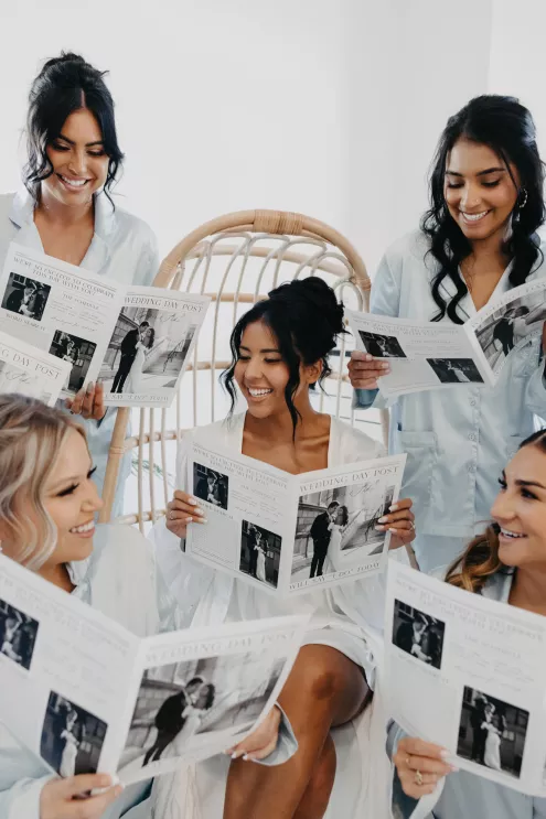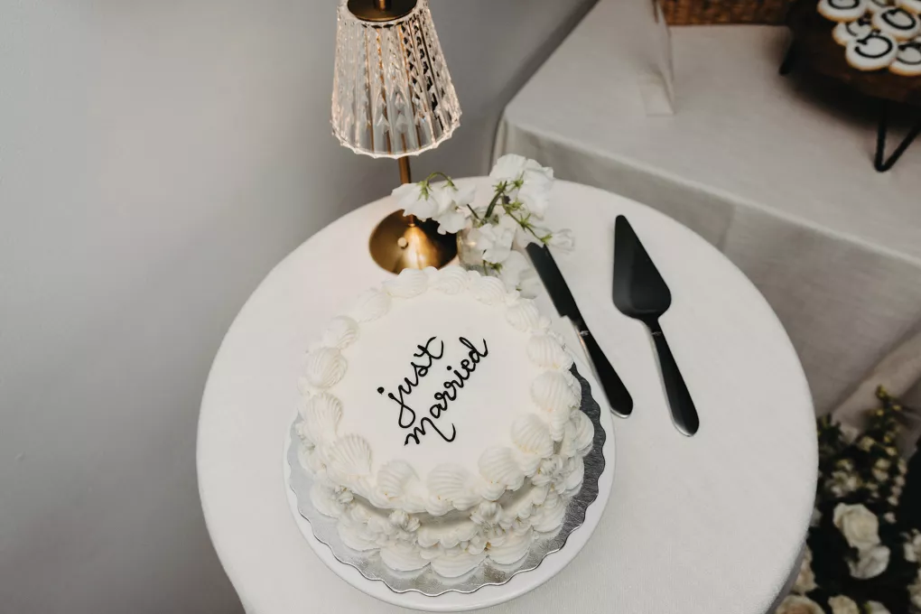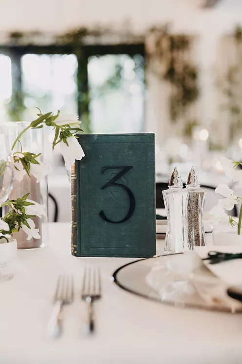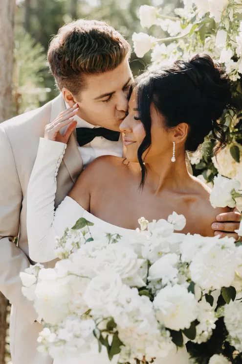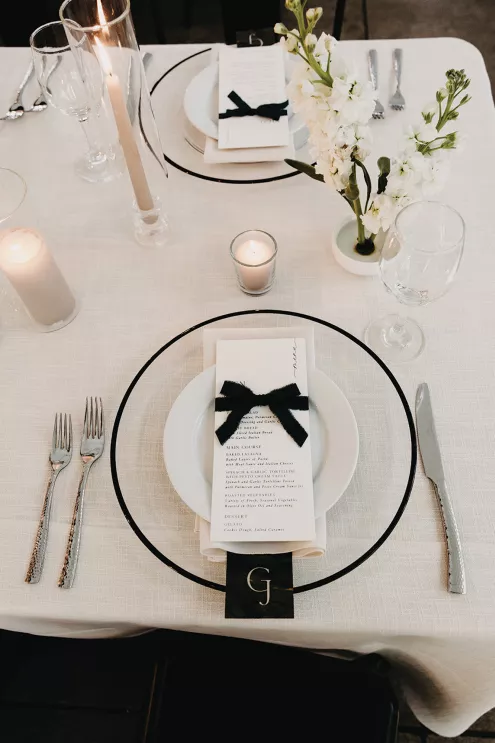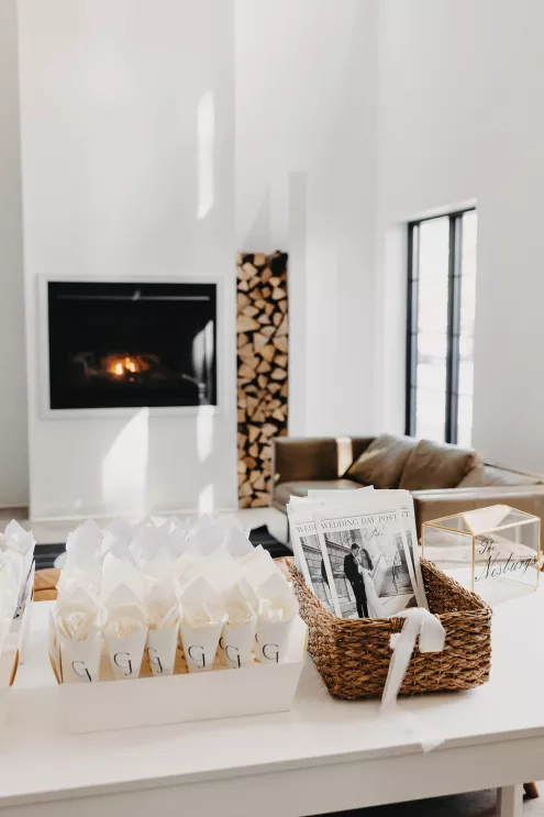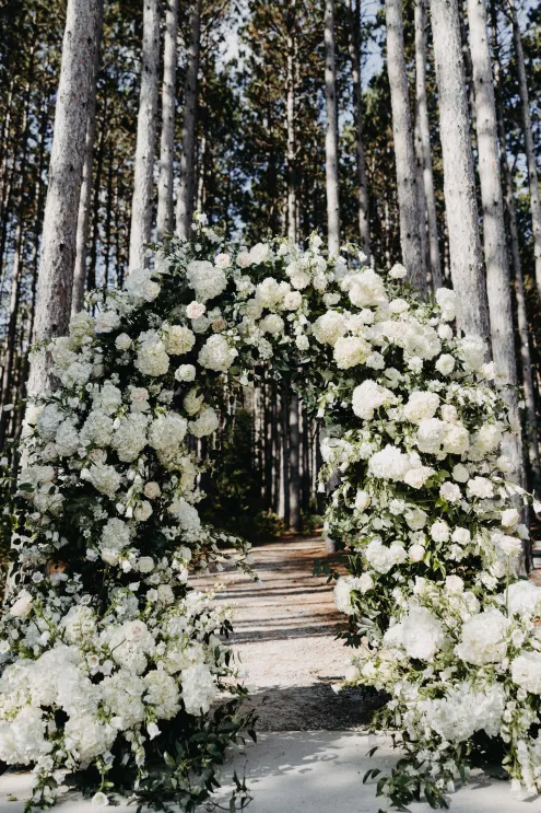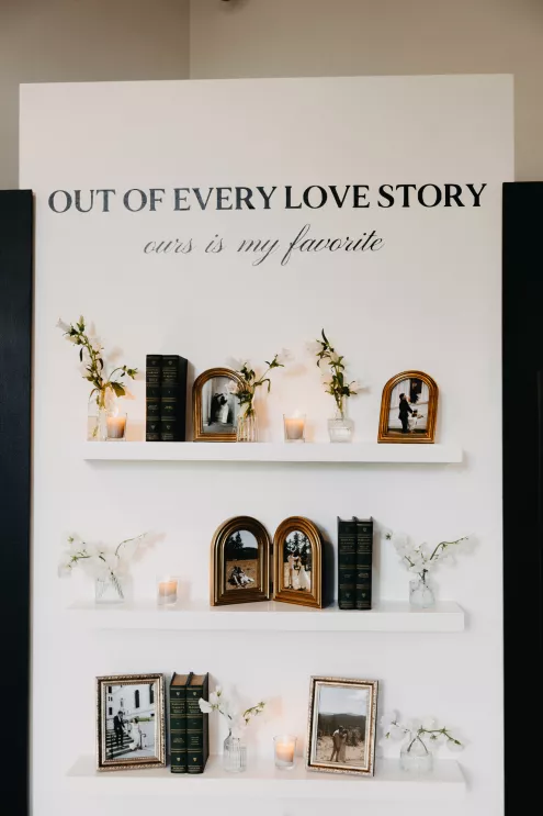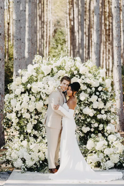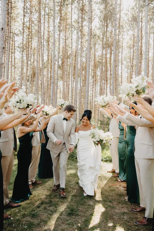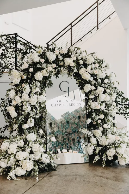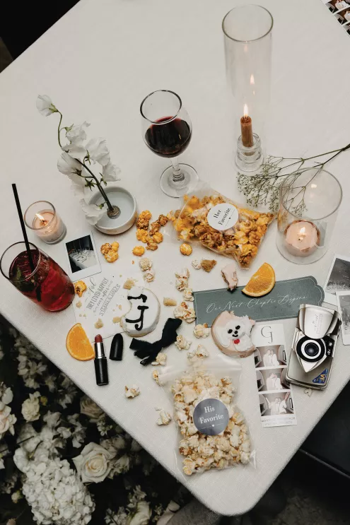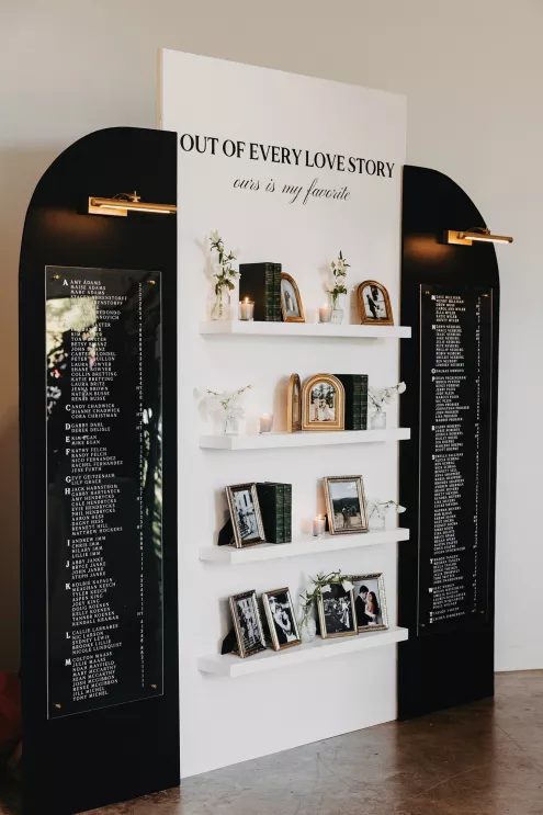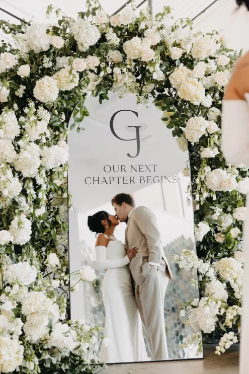 The moment that high school sweethearts Grace Myler and Jake Nesburg saw the towering trees at Pinewood, they instantly knew that it was the perfect place to host their big day. As the founder of wedding content creation company Grace Myler Media, Grace made sure the day was full of intention and beauty. Beneath the natural beauty of the venue, the couple tied the knot in front of a jaw-dropping floral arch comprised of sweet peas and ranunculus, “a seamless fusion of nature and design,” the bride explains. As an avid reader, Grace wished to have a celebration that emphasized the beginning of the next chapter of their relationship, and she implemented this bookish idea throughout the design of the reception. From the start, family and friends were invited to find their seats on either side of an elegantly styled bookshelf that served as part of the seating chart. Dark green books that served as table numbers sat between bud vases and taper candles that trickled their way down the tables. Cocktail napkins that adorably said, “And they lived happily ever after,” as well as custom bookmarks and newspapers were cute touches that tied together the romance and class of the day. The ceremony arch, having been moved inside, served as a stunning frame for the photo-op mirror—a must at any content creator’s wedding. For their first dance, the bride surprised her new husband by wearing his mother’s wedding gown. As the evening went on, guests were welcomed to popcorn bags labeled “His Favorite” or “Her Favorite” as a creative twist on the signature cocktail trend. With two more outfit changes throughout the night, the bride was able to show off her incredible love for fashion while keeping the party fresh and lively.