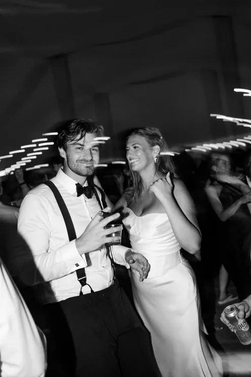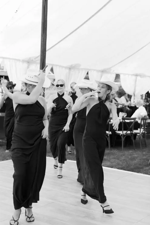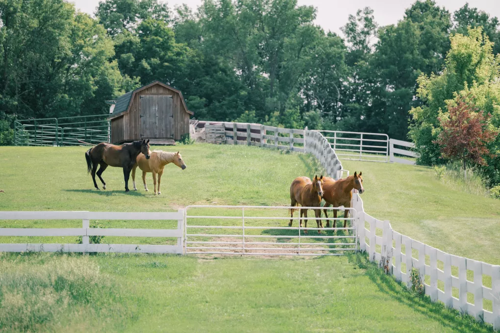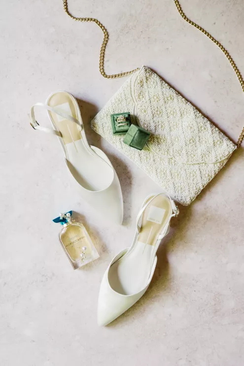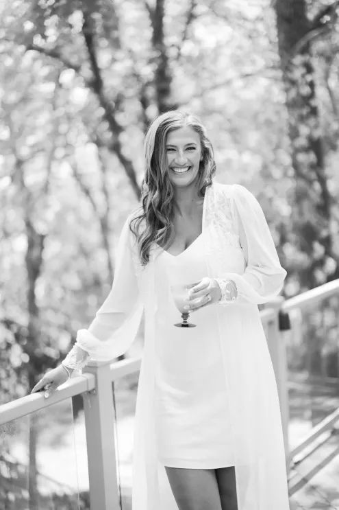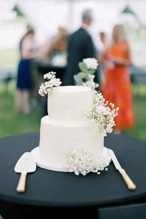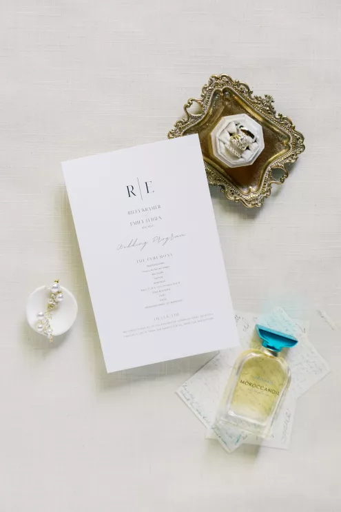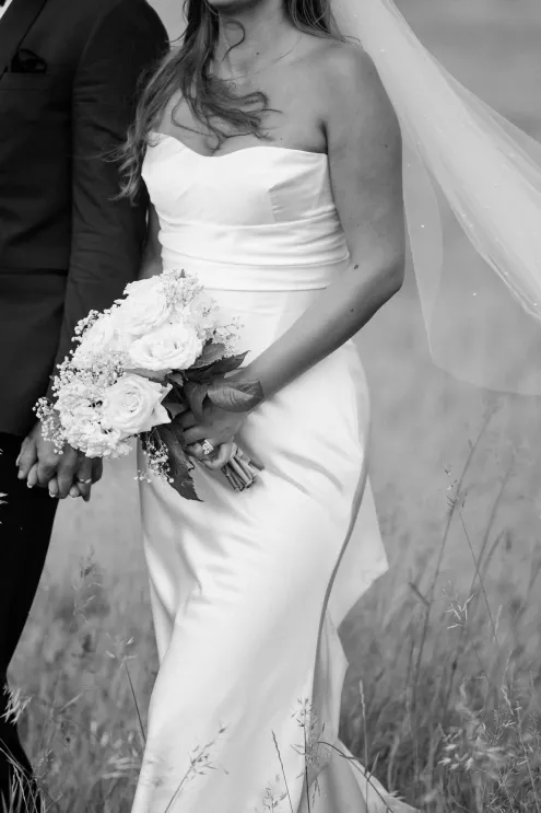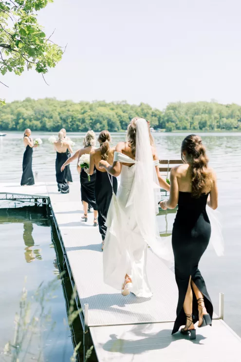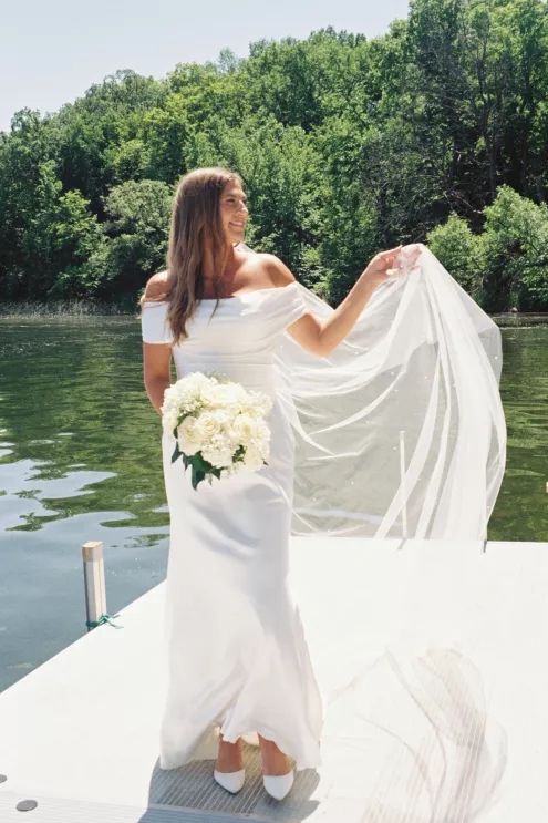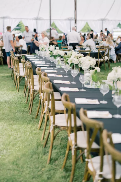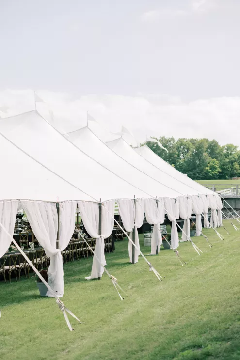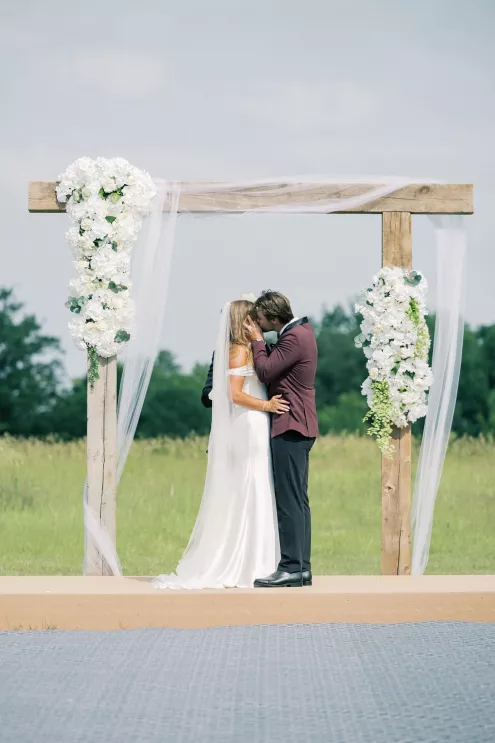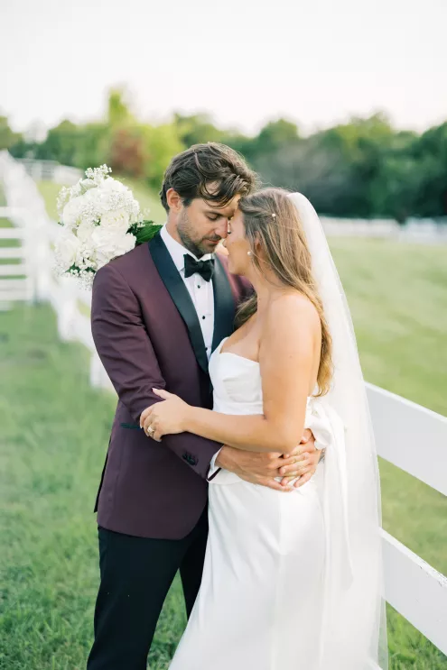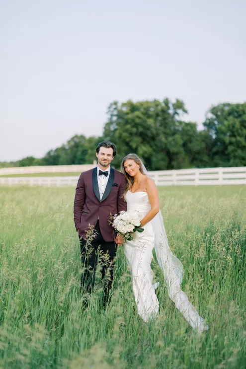 There was a sweet calm that settled over the morning of Emily and Riley’s wedding—the kind that comes when every detail has been chosen for a reason. They got ready on-site at the bride’s family farm, surrounded by close family and friends. Emily’s sleek gown paired effortlessly with her cathedral-length veil, while Riley’s deep burgundy jacket added a refined pop of color against the neutral tones of the day. The ceremony took place outdoors under an open sky, framed by a wooden arch built by the groom and his father, softened with white blooms and winding greenery. The celebration continued across the family’s property, where guests were greeted by some of the farm’s most beloved residents—horses, goats, chickens, cats and dogs. Even Emily’s miniature pony, Princess, made an appearance. Beneath a sailcloth tent, long wooden tables were dressed in black linens, gold flatware and arrangements of white and blush flowers, sourced by the bride, set in antique glass and hurricane vases. Candles and mirrored accents caught the light as dinner, prepared by a family friend, was served. Instead of a receiving line, Emily and Riley visited each table to gift personalized wine bottles and thank guests for coming. Later, they cut a white cake trimmed with baby’s breath and danced late into the night. The beams from their handmade altar will one day become fireplace mantels in their home—a lasting memorial of a day built on love and family