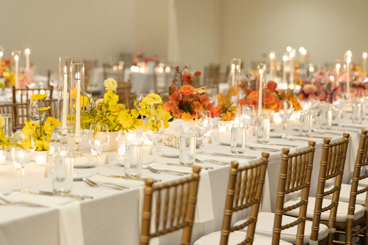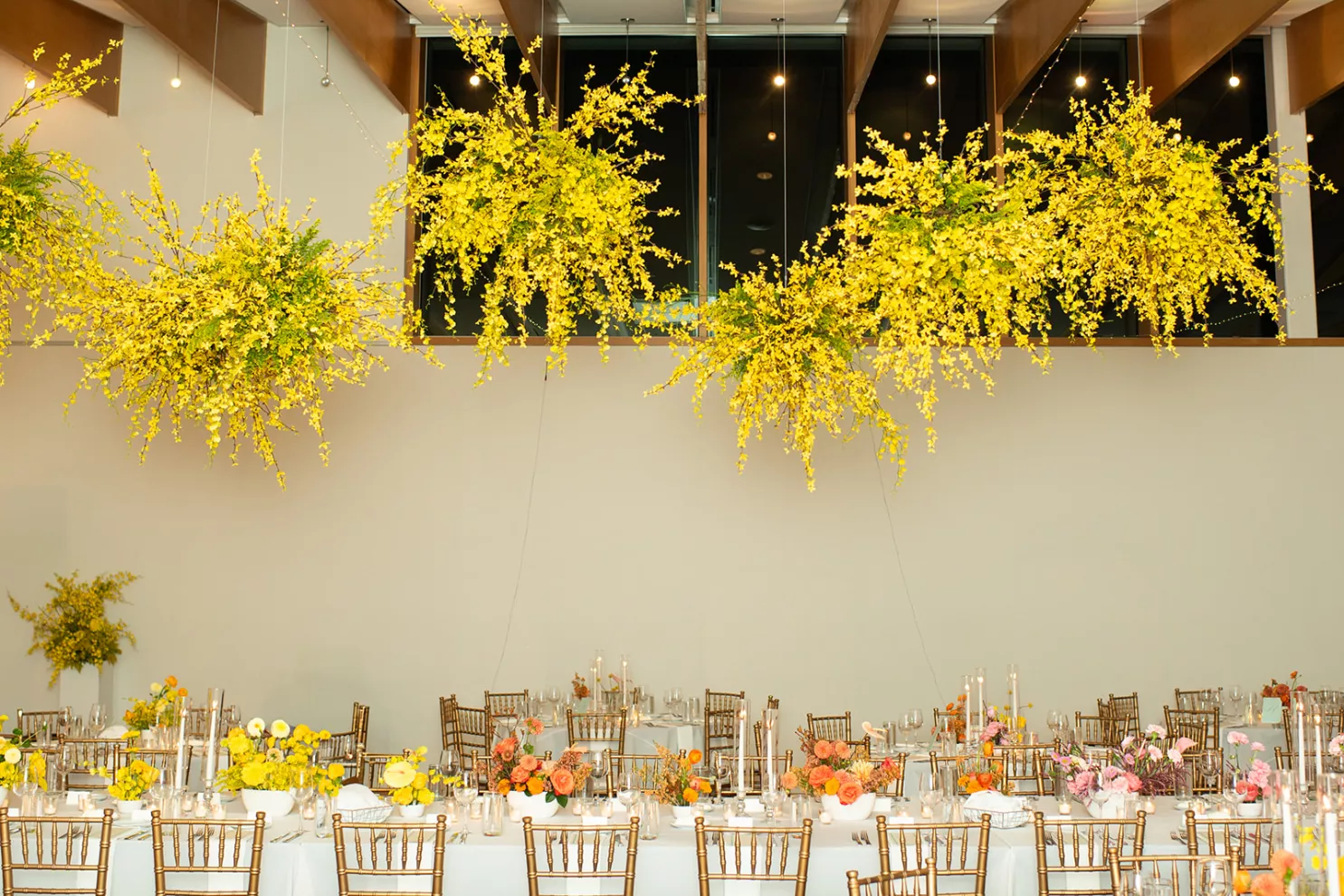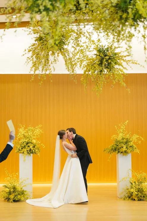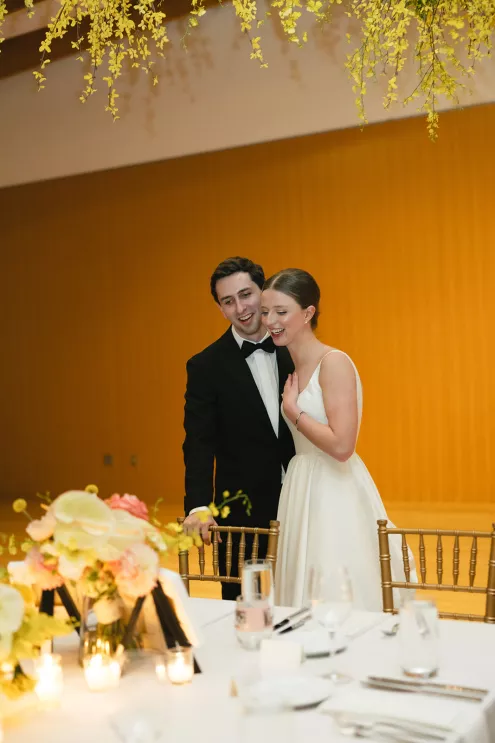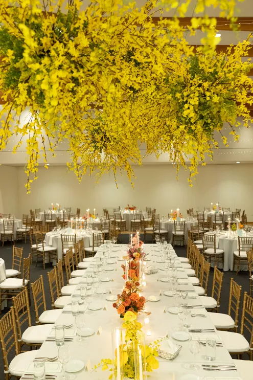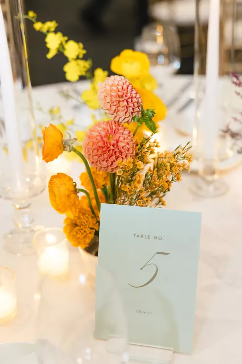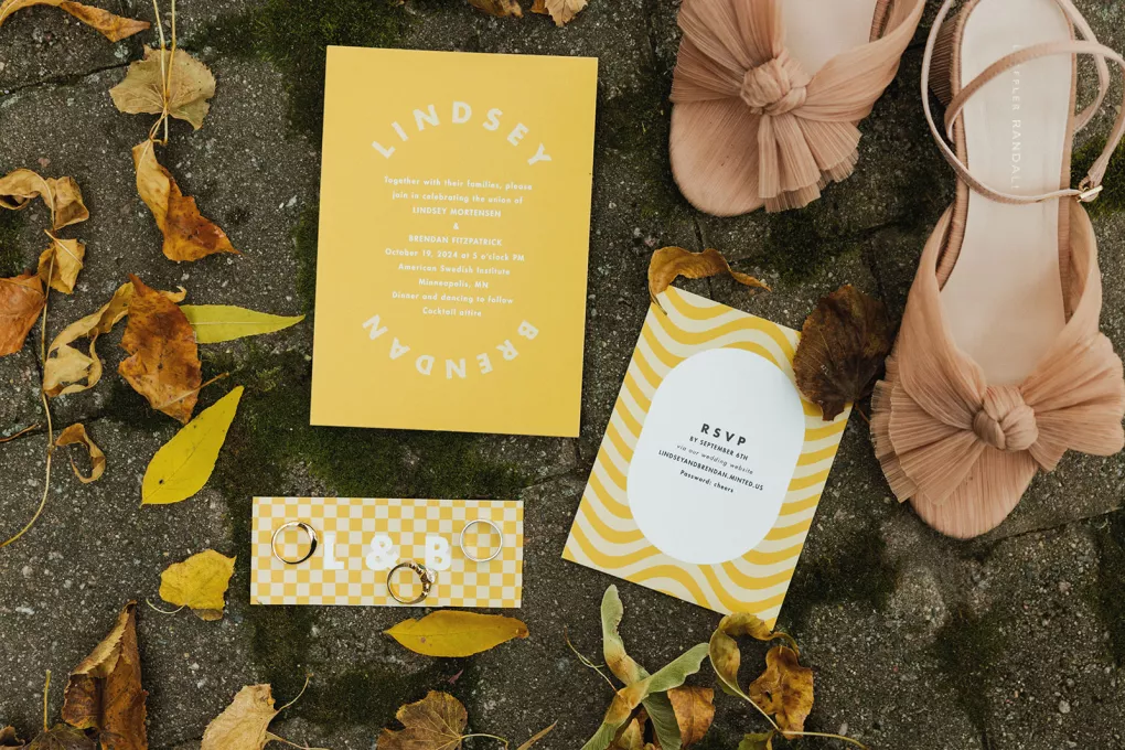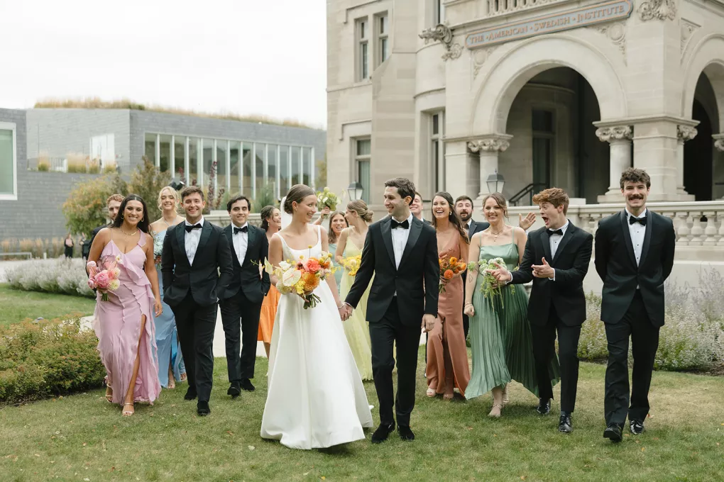While designing their wedding and celebration alongside an expert team of vendors, college sweethearts Lindsey Mortensen and Brendan Fitzpatrick set out to create a minimalist wedding with maximum color. From the get-go, the invitation suite reflected their bold personalities with its fun yellow and white design. The stunning architecture and interior of the American Swedish Institute provided elegance and grandeur, while the venue’s muted tones made the florals held by Lindsey and each of her bridesmaids—who wore gowns to match their bouquet hue—stand out. Hanging from the ceiling of Larson Hall was a jaw-dropping, monochromatic yellow floral display—the first ever large floral installation held in the Hall—that guided the bride down the aisle toward pillars of even more yellow arrangements. This bright and fresh design choice brought a breath of summer air to the fall day. At the reception, the wedding party sat at the head table beneath a grand installation of blooms while an ombré of yellow, orange and pink florals stretched its way down the table. Every guest table was adorned with small arrangements of a variety of stems, separated by color into white vases. The remainder of the tablescape design was kept simple and neutral, allowing the bright centerpieces to pop. Sipping on lemon cocktails, attendees joined Brendan and Lindsey—who had changed into her second dress of the evening—on the dance floor before dancing the night away.