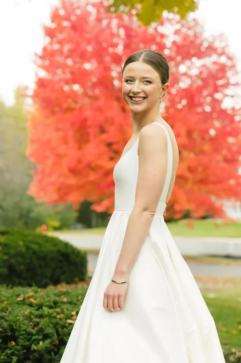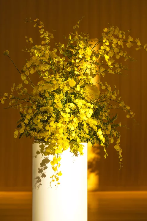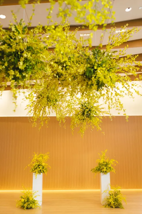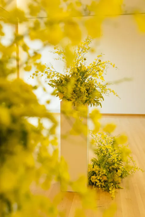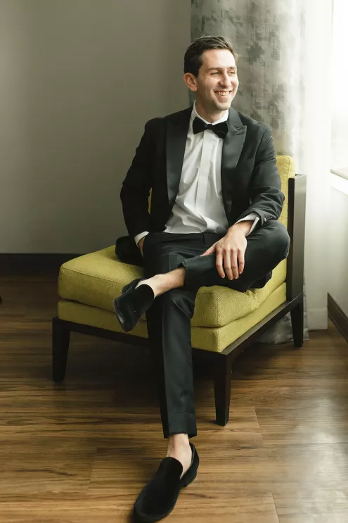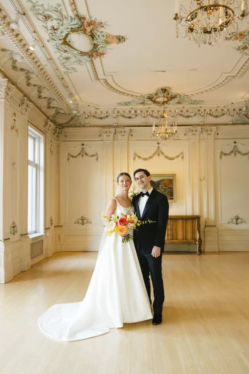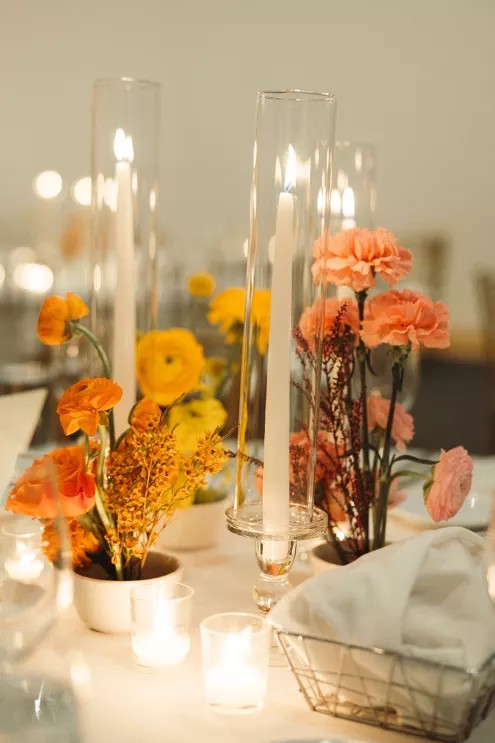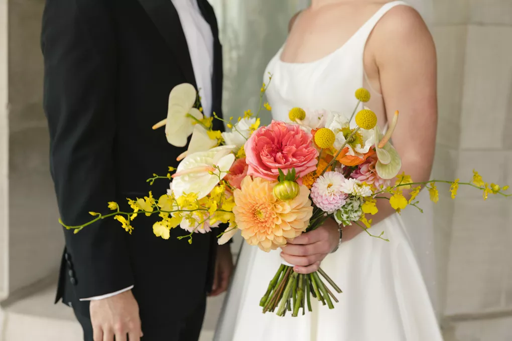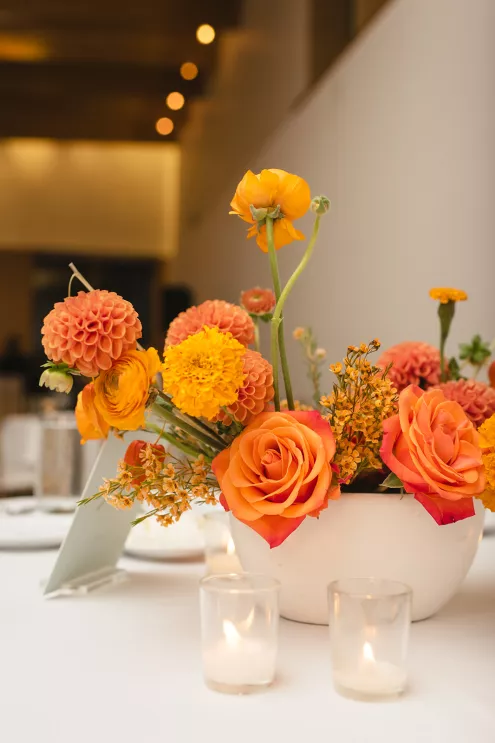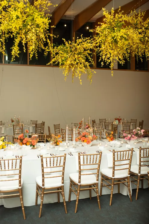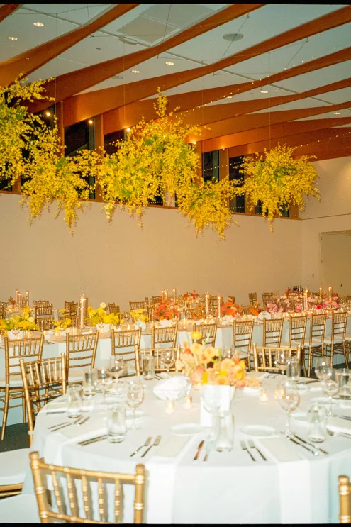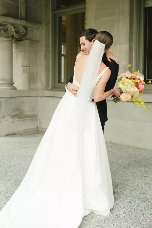 While designing their wedding and celebration alongside an expert team of vendors, college sweethearts Lindsey Mortensen and Brendan Fitzpatrick set out to create a minimalist wedding with maximum color. From the get-go, the invitation suite reflected their bold personalities with its fun yellow and white design. The stunning architecture and interior of the American Swedish Institute provided elegance and grandeur, while the venue’s muted tones made the florals held by Lindsey and each of her bridesmaids—who wore gowns to match their bouquet hue—stand out. Hanging from the ceiling of Larson Hall was a jaw-dropping, monochromatic yellow floral display—the first ever large floral installation held in the Hall—that guided the bride down the aisle toward pillars of even more yellow arrangements. This bright and fresh design choice brought a breath of summer air to the fall day. At the reception, the wedding party sat at the head table beneath a grand installation of blooms while an ombré of yellow, orange and pink florals stretched its way down the table. Every guest table was adorned with small arrangements of a variety of stems, separated by color into white vases. The remainder of the tablescape design was kept simple and neutral, allowing the bright centerpieces to pop. Sipping on lemon cocktails, attendees joined Brendan and Lindsey—who had changed into her second dress of the evening—on the dance floor before dancing the night away.