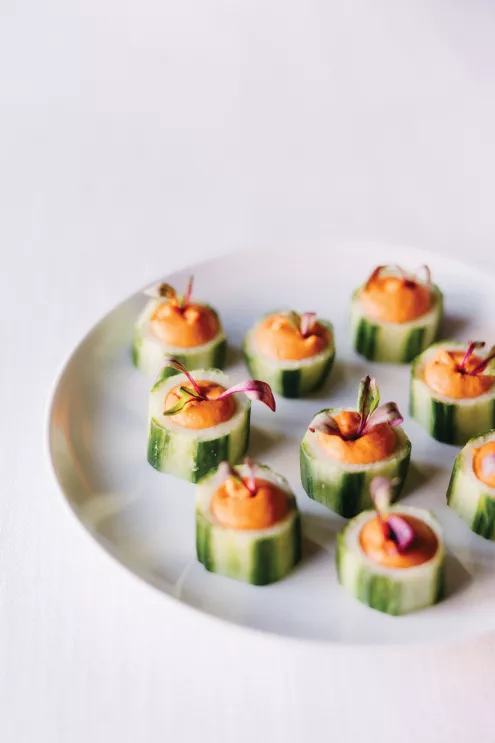 CUCUMBER CUPS WITH SPICY RED PEPPER HUMMUS