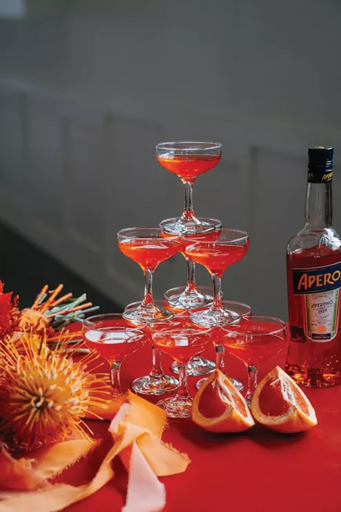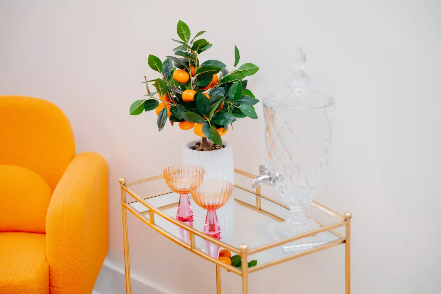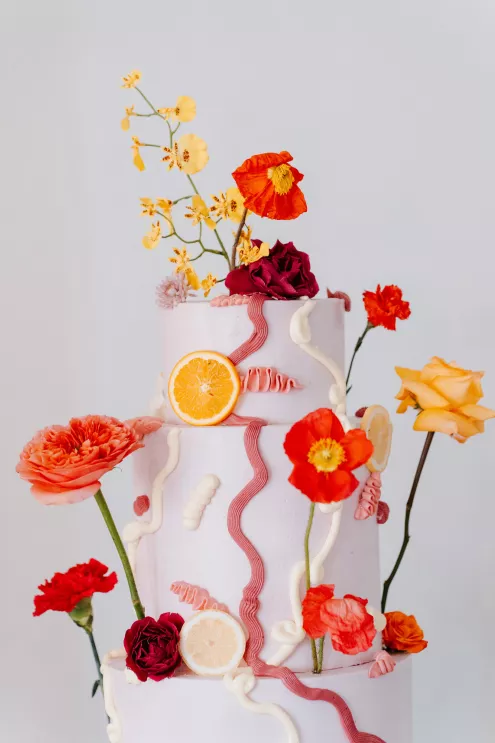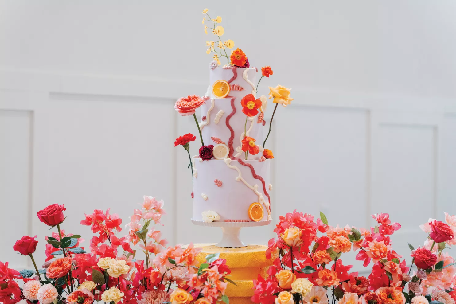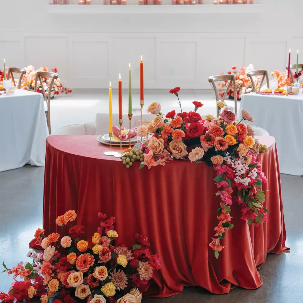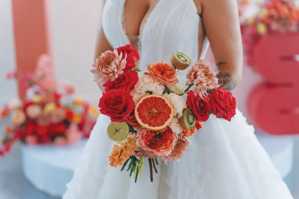 A juicy palette of mouthwatering hues brings the minimalist walls of Woodhaven Weddings + Events to life in a design celebrating the revitalizing energy of spring and summer. Vibrant orange, goldenrod and infrared-hued florals weave throughout the space in little bursts of sunshine. The ceremony amplifies the venue’s modern sensibilities with the petal-lined aisle leading to a unique retro-inspired altar. In a nod to the reception design, fresh fruit peeks out between the blooms of the cheerful bouquets.