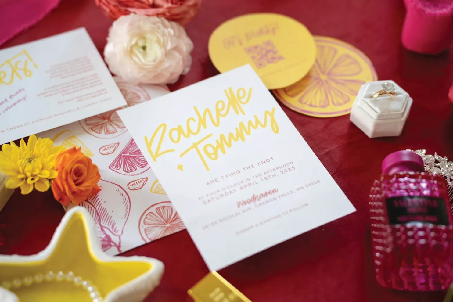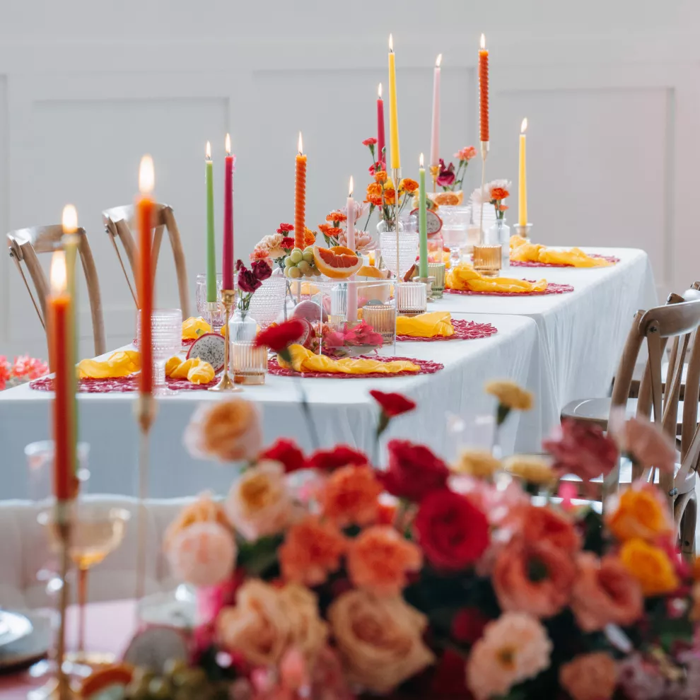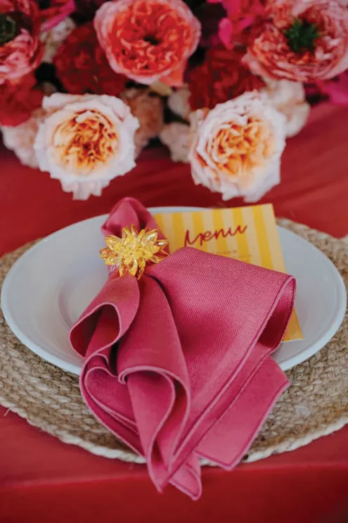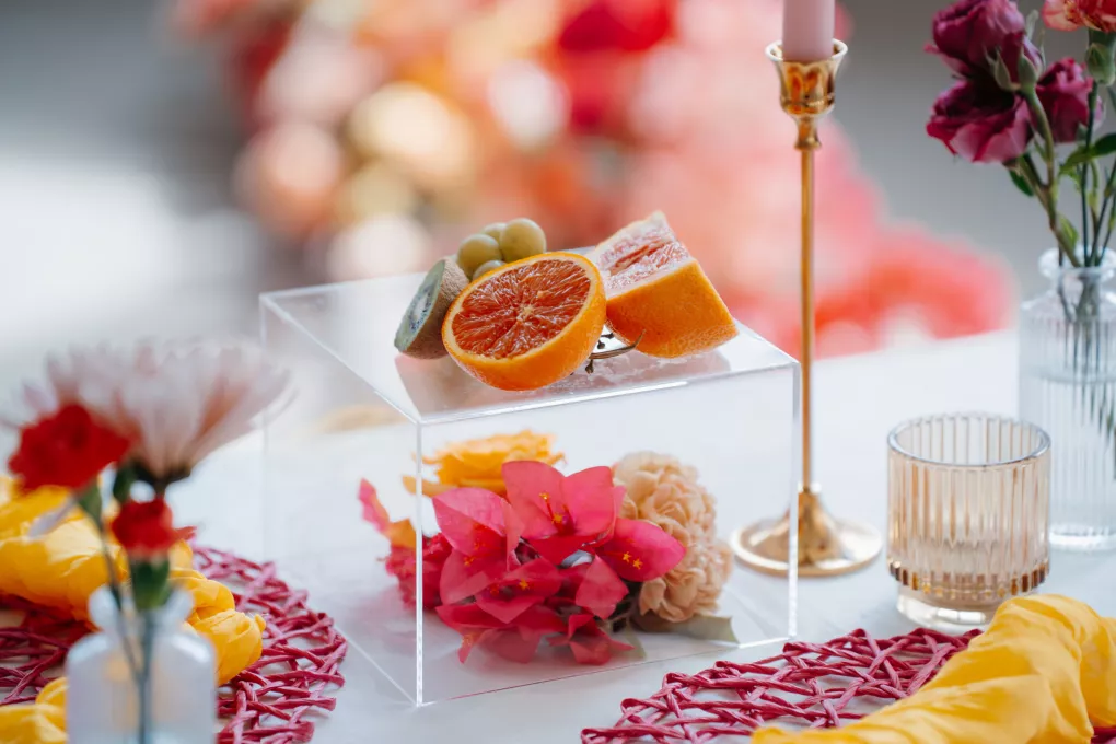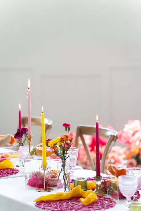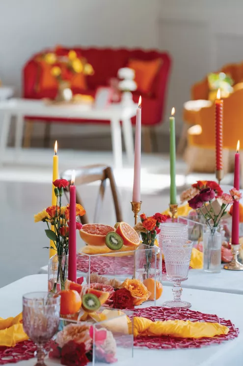 Tablescapes featuring brightly-hued placemats and multicolored textured taper candles are enhanced with small bud vases and a variety of fruit including grapefruit, kiwi, dragonfruit and even sliced cantaloupe. Incorporating the hues of the tactfully arranged dining space, the bold sweetheart table sits at the center of the nontraditional floor plan, overflowing with abundant floral arrangements and candlelight. The imagined evening wraps with the ultimate send-off: a balloon-filled bounce house.