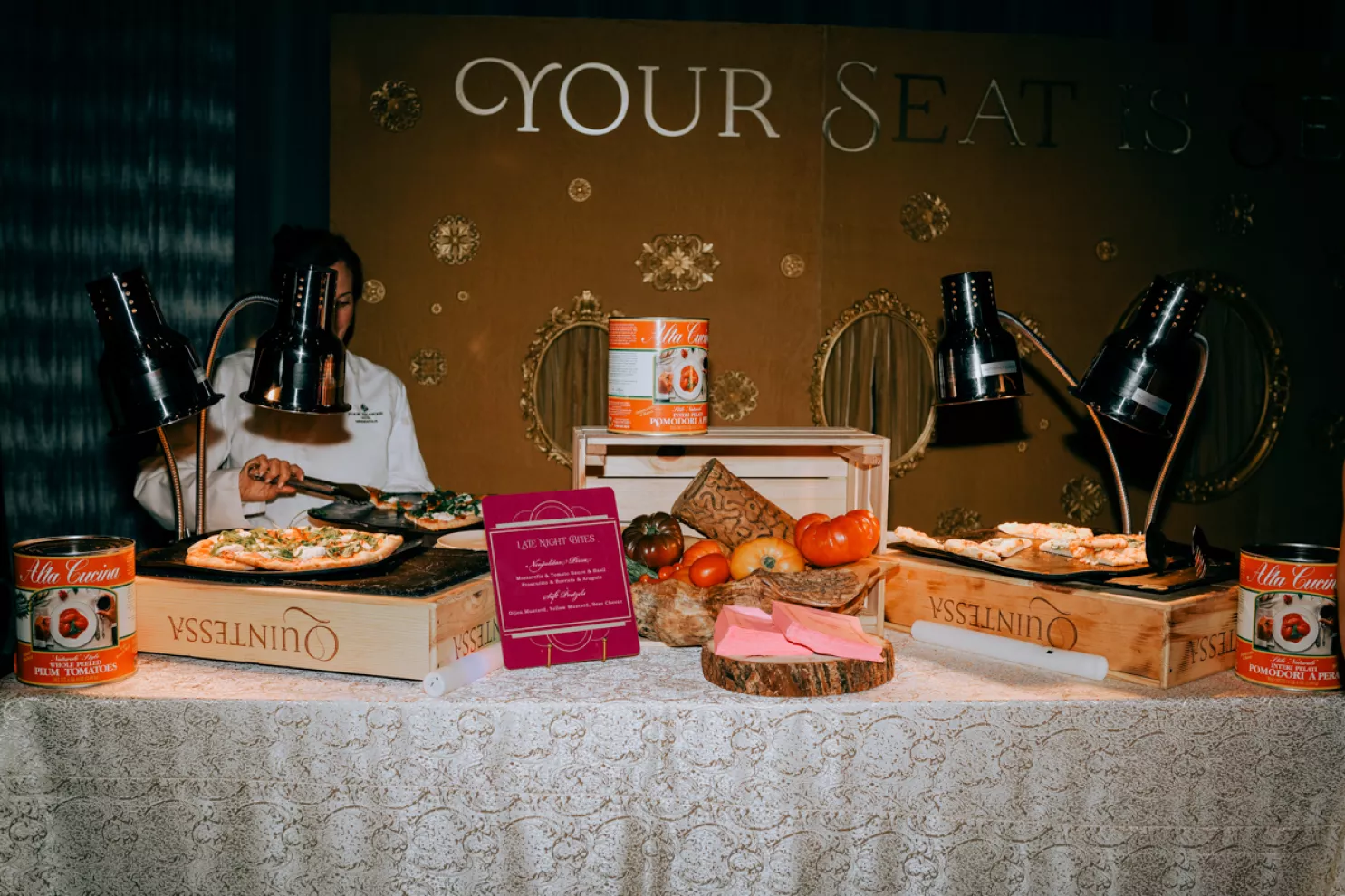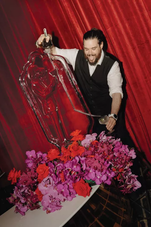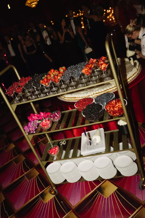 Throughout the luxe experience, guests savored a variety of culinary treasures, from mini lobster rolls and cacio e pepe risotto, to late-night New York-style pretzels, pizza and gelato. “Every design concept I proposed centered on that energy, drama, glamour and a bit of magic,” Mansy says. Disco performers, live music, a four-foot-long millefoglie cake and an afterparty at Four Seasons’ bar, Mara, offered a cinematic ending to the magnificent black-tie soirée.