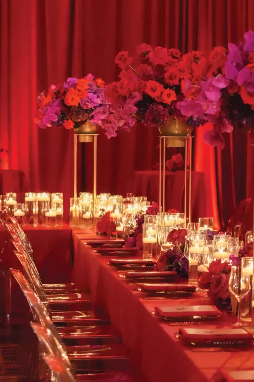 Service began as soon as guests arrived, greeted by fiery florals and attendants in chic red suits guiding them to the event space. Guests passed through candlelit corridors, receiving champagne flutes with monogrammed popcorn cones along the way, before entering a theatrical ceremony scene defined by sweeping red drapery, towering chandeliers and a floral aisle leading to a stage. “It was a scene I designed to evoke awe and emotion, balancing intimacy with spectacle,” Mansy says.