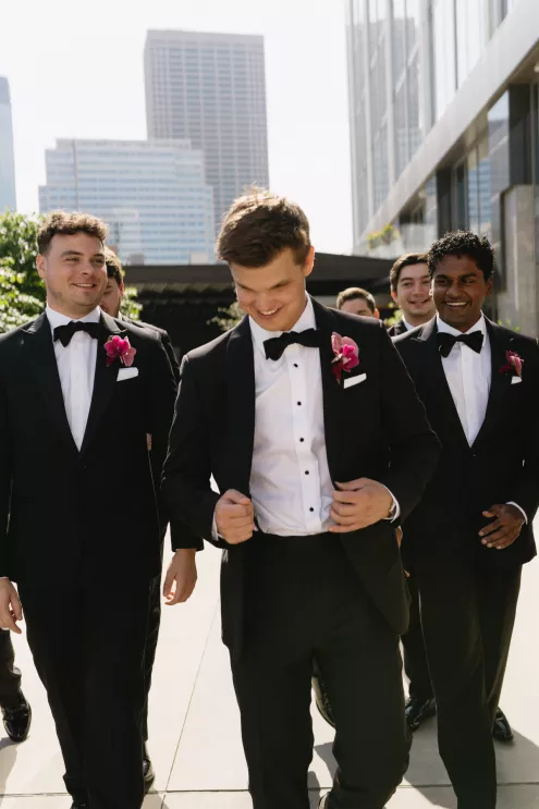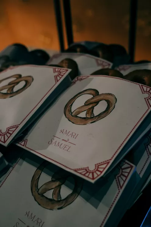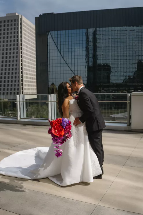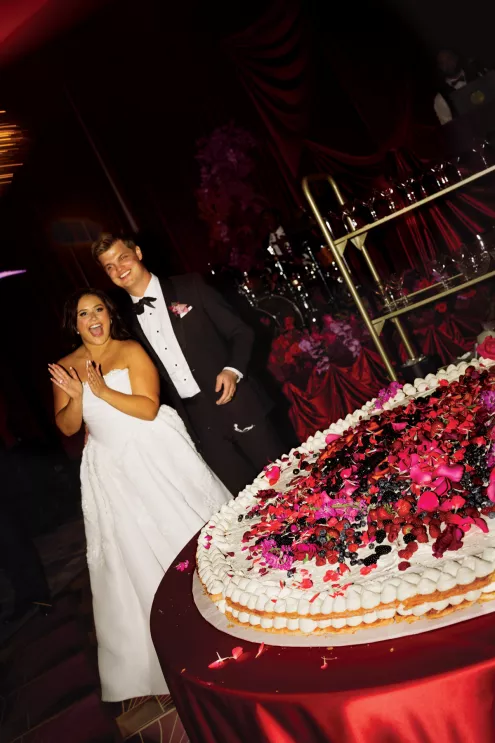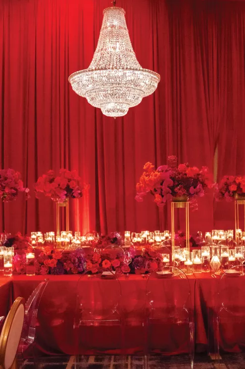 “Swanky,” “extravagant” and “magical” were the three words Amari wanted to emulate at her and Sam’s wedding day—and that they did, with the help of wedding pro, Ashley Mansy, founder and lead planner of Poppati Events. Drawing inspiration from their love of New York City, movie theaters and extravagant cuisine, the Four Seasons Hotel Minneapolis was transformed into a red dreamscape where bold design and guest experience combined to create a standout celebration. “From the start, Amari and Sam’s vision was unapologetically bold,” Mansy says. “An Old Hollywood dream reimagined through a modern, immersive lens.”