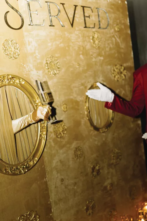 Cocktail hour was as immersive as the ceremony. Guests were serenaded by a live saxophonist, enjoyed a roaming caviar cart and glasses of bubbly etched with names and seat assignments emerged from hands inside an artful installation. “Our top priority was to make our guests feel as special as we felt that day,” Amari says. The couple even included their dog, Crouton, with an ice luge, matchboxes and menus bearing his image.